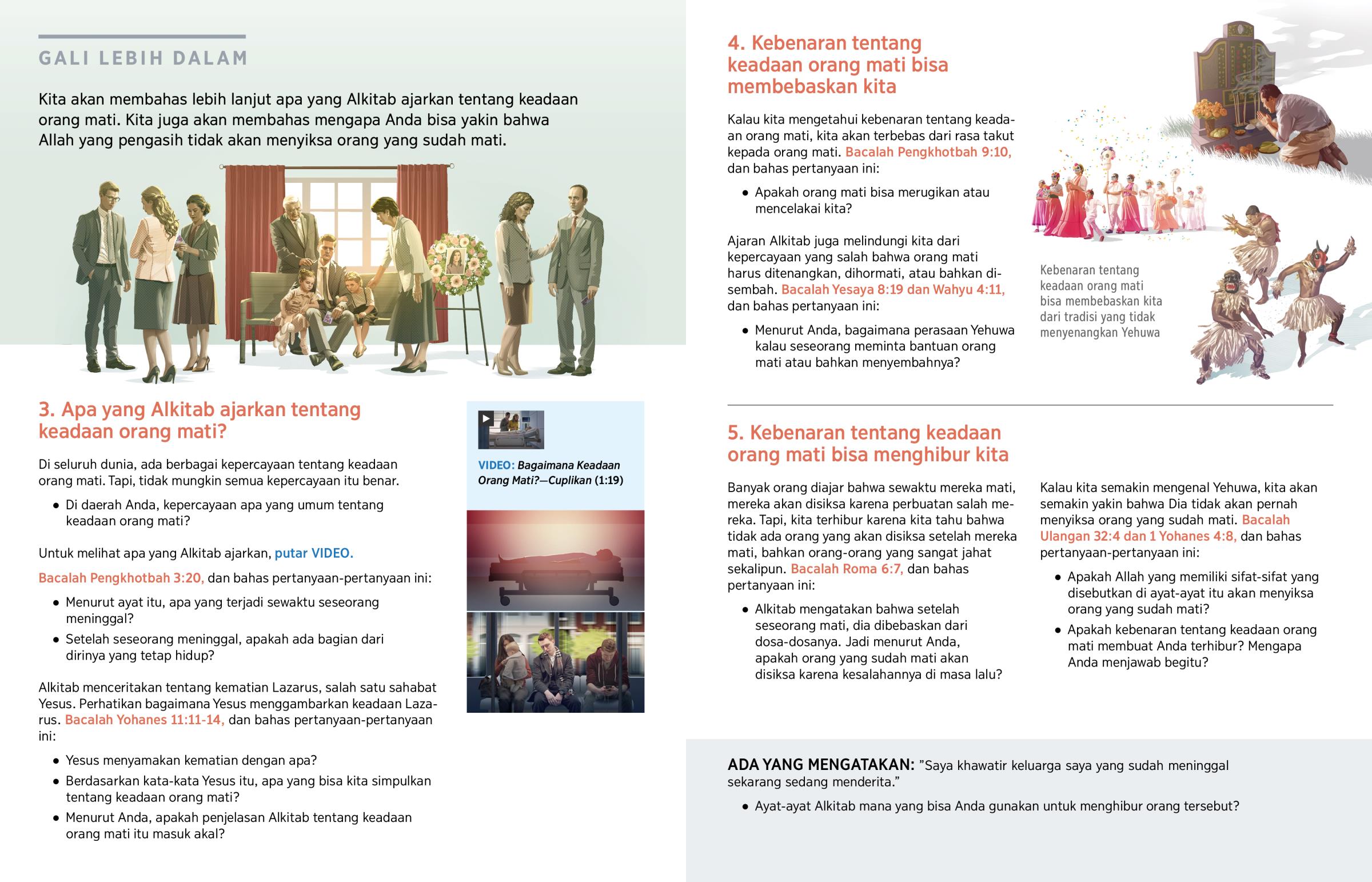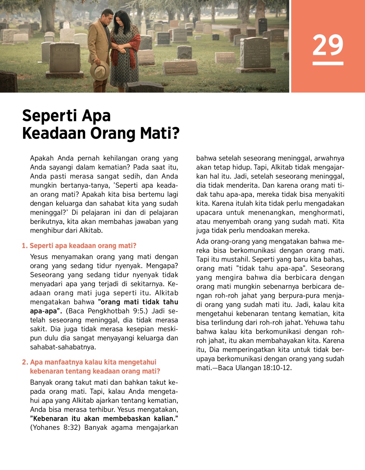 Apakah Anda pernah kehilangan orang yang Anda sayangi dalam kematian? Pada saat itu, Anda pasti merasa sangat sedih, dan Anda mungkin bertanya-tanya, ’Seperti apa keadaan orang mati? Apakah kita bisa bertemu lagi dengan keluarga dan sahabat kita yang sudah meninggal?’ Di pelajaran ini dan di pelajaran berikutnya, kita akan membahas jawaban yang menghibur dari Alkitab.