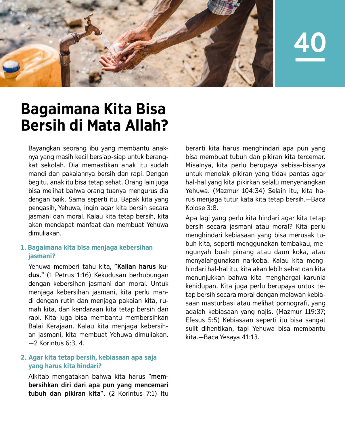 Bayangkan seorang ibu yang membantu anaknya yang masih kecil bersiap-siap untuk berangkat sekolah. Dia memastikan anak itu sudah mandi dan pakaiannya bersih dan rapi. Dengan begitu, anak itu bisa tetap sehat. Orang lain juga bisa melihat bahwa orang tuanya mengurus dia dengan baik. Sama seperti itu, Bapak kita yang pengasih, Yehuwa, ingin agar kita bersih secara jasmani dan moral. Kalau kita tetap bersih, kita akan mendapat manfaat dan membuat Yehuwa dimuliakan.