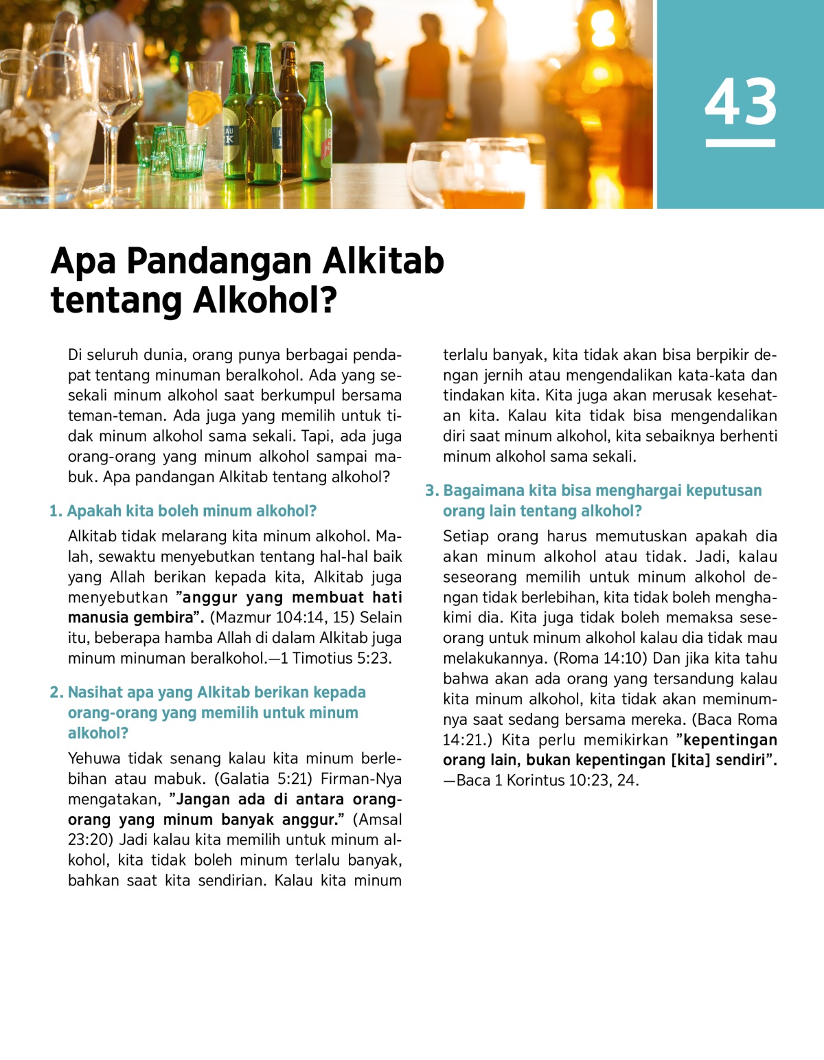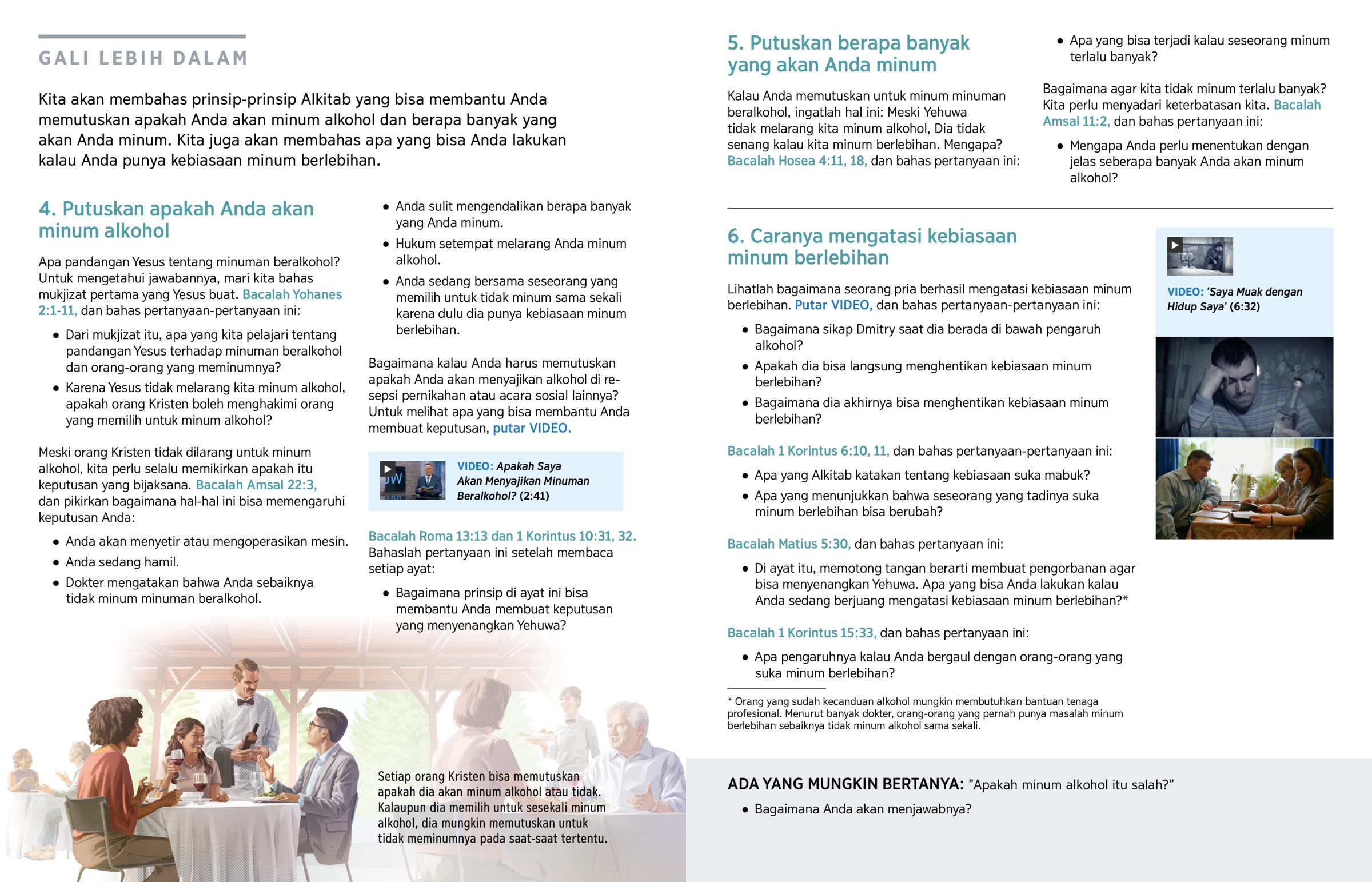 Kita akan membahas prinsip-prinsip Alkitab yang bisa membantu Anda memutuskan apakah Anda akan minum alkohol dan berapa banyak yang akan Anda minum. Kita juga akan membahas apa yang bisa Anda lakukan kalau Anda punya kebiasaan minum berlebihan.