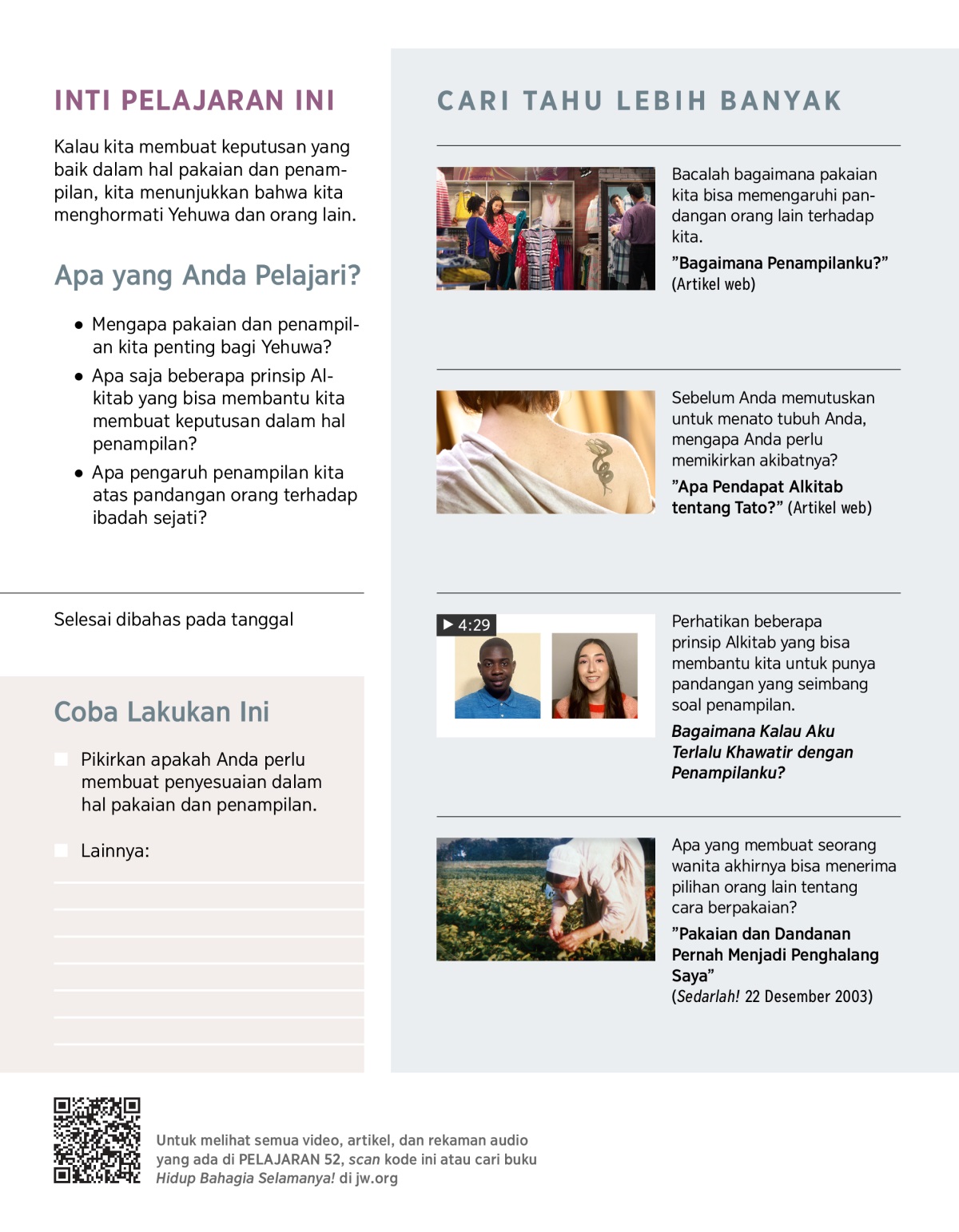 Tidak soal pakaian kita mahal atau murah, pakaian itu harus selalu bersih dan cocok dengan kegiatan yang sedang kita lakukan. Bacalah 1 Korintus 10:24 dan 1 Timotius 2:9, 10. Lalu, bahas alasannya kita tidak mau menggunakan pakaian yang . . .
