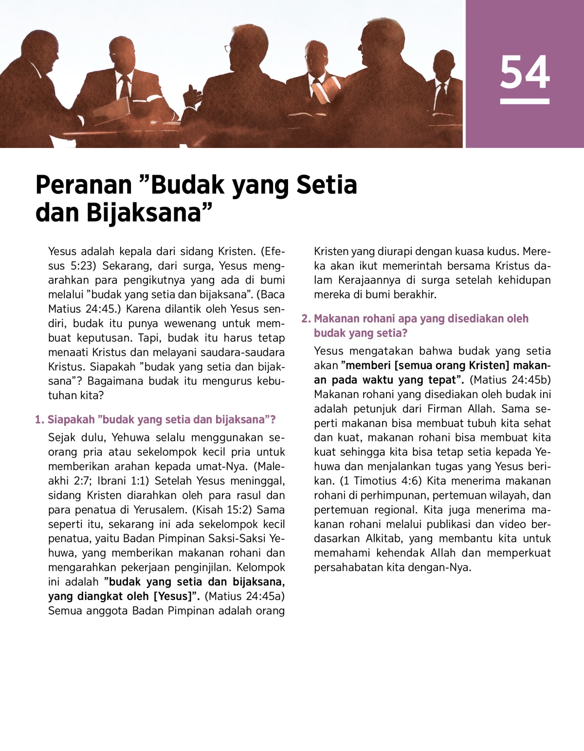 Badan Pimpinan adalah ”budak yang setia dan bijaksana”, yang dilantik oleh Kristus. Badan Pimpinan memberikan petunjuk dan makanan rohani untuk orang Kristen di seluruh dunia.
