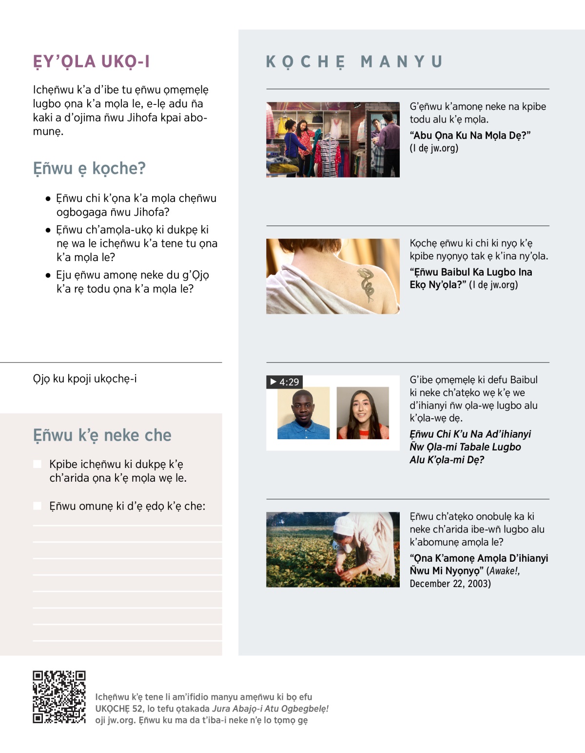 Ọgbọ duu wa che n’ọna ojoji ojoji k’a tene k’a na mọla le. Ichẹñwu k’a lebọ amọla-ukọ ki defu Baibul lugbo ọla emu, e-lẹ ajẹñwu wa k’a neke mọla ọna ki ny’uwa eju, ki la ñọ jẹñwu ẹdọ Jihofa bọ gẹ. K’a kọchẹ lugbo amọla-ukọ ka ki kọla lugbo ọla emu.