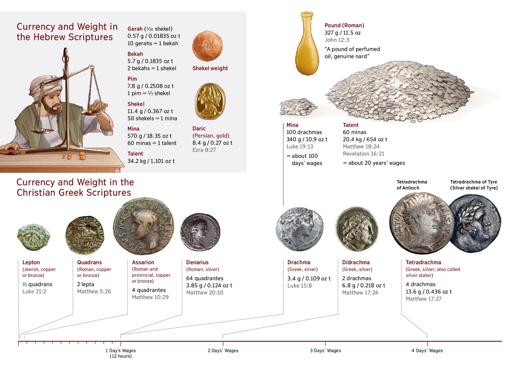 Talent 60 minas 20.4 kg / 654 oz t = about 20 years’ wages |