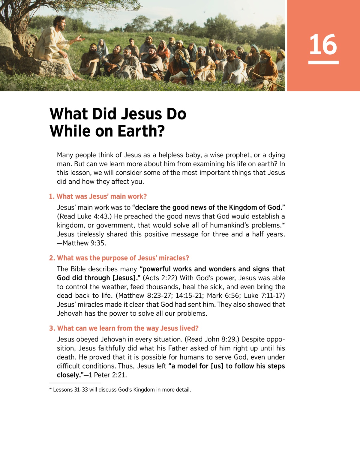 Many people think of Jesus as a helpless baby, a wise prophet, or a dying man. But can we learn more about him from examining his life on earth? In this lesson, we will consider some of the most important things that Jesus did and how they affect you.