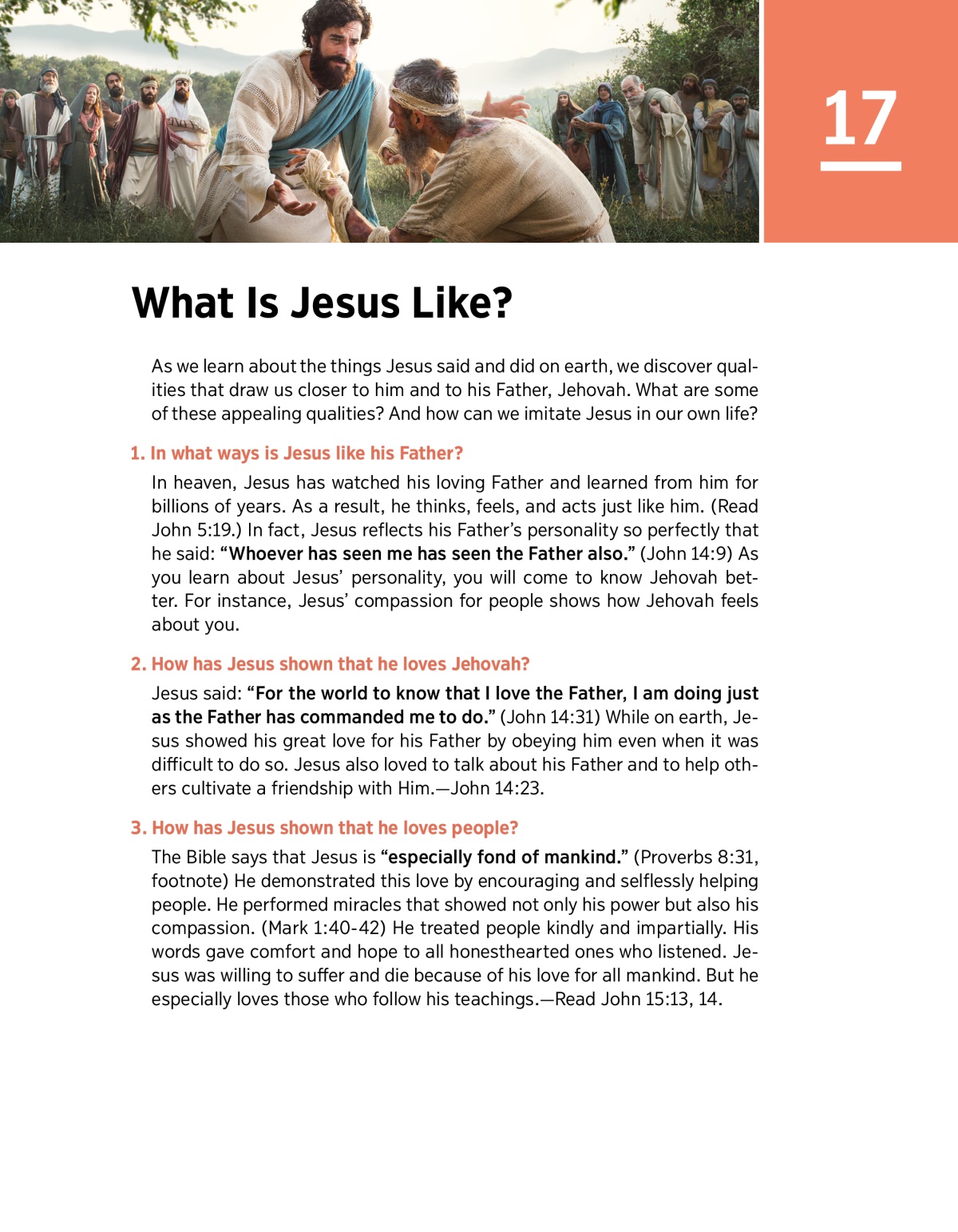 In heaven, Jesus has watched his loving Father and learned from him for billions of years. As a result, he thinks, feels, and acts just like him. (Read John 5:19.) In fact, Jesus reflects his Father’s personality so perfectly that he said: “Whoever has seen me has seen the Father also.” (John 14:9) As you learn about Jesus’ personality, you will come to know Jehovah better. For instance, Jesus’ compassion for people shows how Jehovah feels about you.
