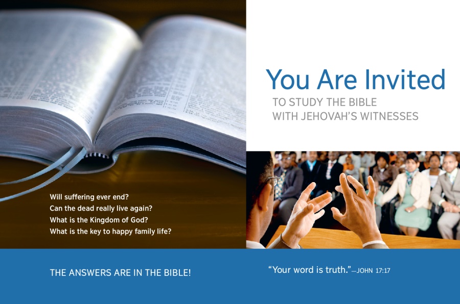 Offer: I’d like to invite you to a free Bible talk. It will be held at the local Kingdom Hall, our place of worship. [Offer the meeting invitation, point out the time and location of the weekend meeting, and mention the theme of the public talk.]