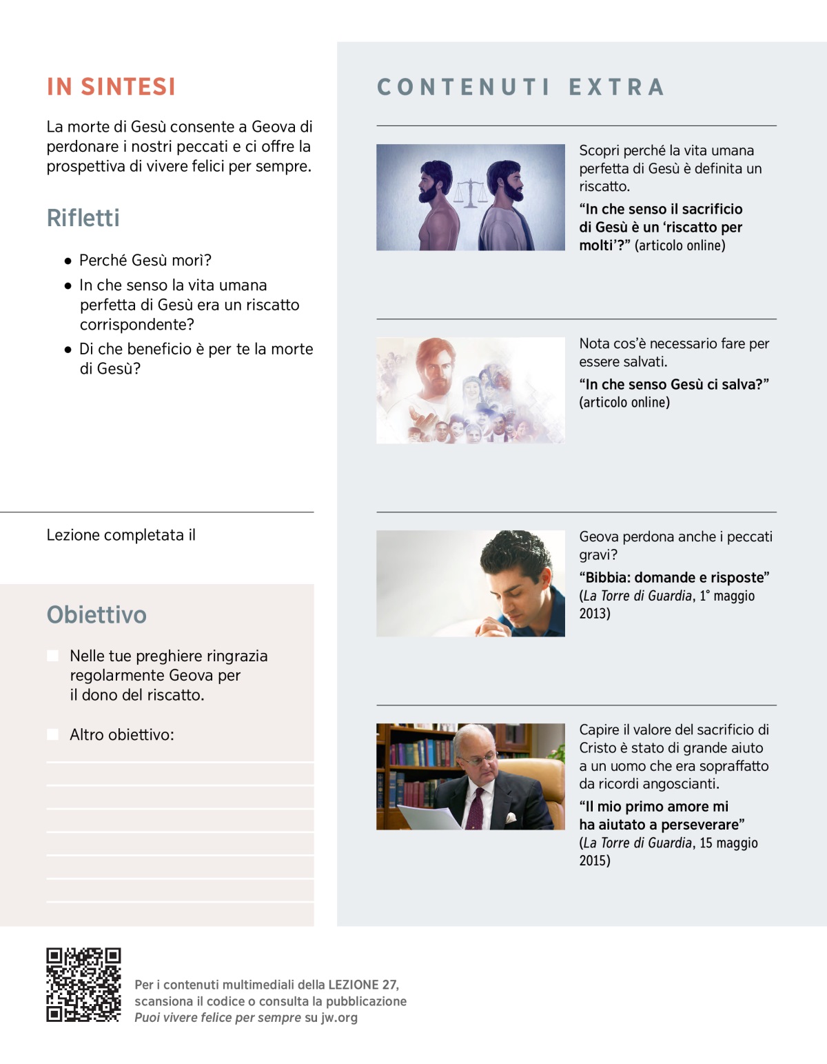 Tutti noi pecchiamo, soffriamo e moriamo perché i primi esseri umani, Adamo ed Eva, disubbidirono a Dio.a Ma non siamo senza via d’uscita. Geova ha stabilito che l’uomo venisse liberato dal peccato e dalla morte tramite suo Figlio, Gesù Cristo. La Bibbia insegna che, morendo per noi, Gesù ha provveduto un riscatto. Un riscatto è il prezzo pagato per liberare qualcuno. Il prezzo che Gesù pagò corrispondeva al valore della sua vita umana perfetta. (Leggi Matteo 20:28.) Rinunciando volontariamente al suo diritto di vivere per sempre sulla terra, Gesù ci ha offerto la possibilità di riottenere tutto quello che Adamo ed Eva avevano perso. Gesù ci ha anche fatto capire quanto lui e Geova ci amano. Questa lezione ti aiuterà a comprendere meglio il valore della morte di Gesù.