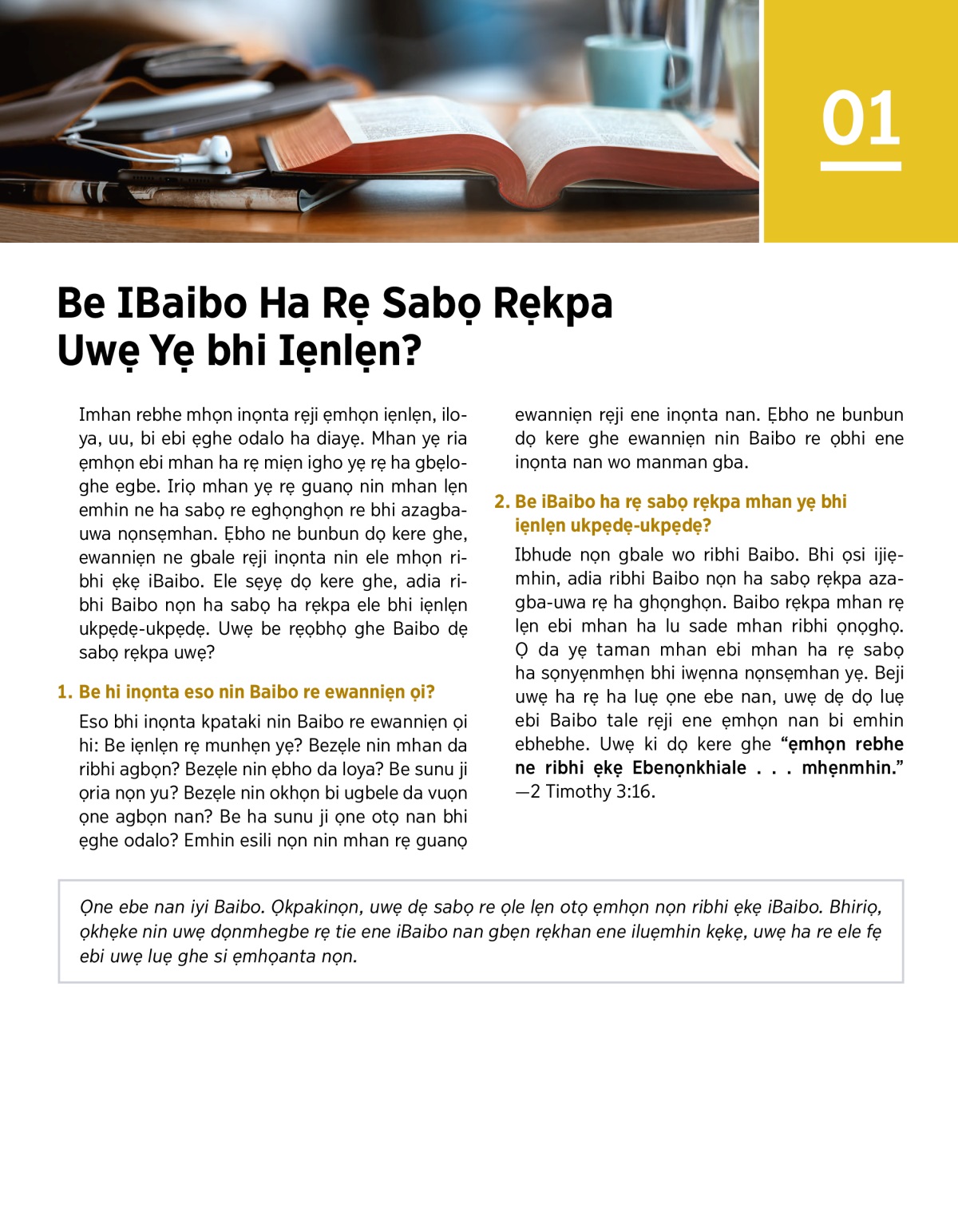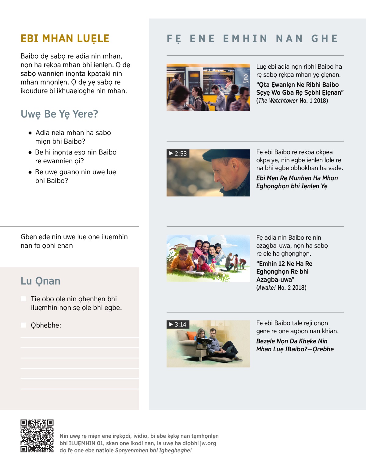 Imhan rebhe mhọn inọnta rẹji ẹmhọn iẹnlẹn, iloya, uu, bi ebi ẹghe odalo ha diayẹ. Mhan yẹ ria ẹmhọn ebi mhan ha rẹ miẹn igho yẹ rẹ ha gbẹloghe egbe. Iriọ mhan yẹ rẹ guanọ nin mhan lẹn emhin ne ha sabọ re eghọnghọn re bhi azagba-uwa nọnsẹmhan. Ẹbho ne bunbun dọ kere ghe, ewanniẹn ne gbale rẹji inọnta nin ele mhọn ribhi ẹkẹ iBaibo. Ele sẹyẹ dọ kere ghe, adia ribhi Baibo nọn ha sabọ ha rẹkpa ele bhi iẹnlẹn ukpẹdẹ-ukpẹdẹ. Uwẹ be mhọn ọria nin uwẹ riale Baibo dẹ sabọ rẹkpa?