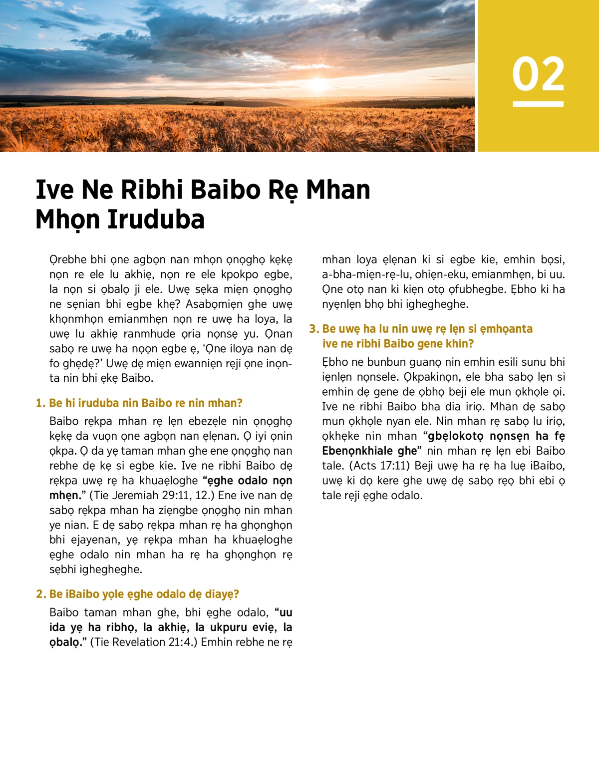 Baibo rẹkpa mhan rẹ lẹn ebezẹle nin ọnọghọ kẹkẹ da vuọn ọne agbọn nan ẹlẹnan. Ọ iyi ọnin ọkpa. Ọ da yẹ taman mhan ghe ene ọnọghọ nan rebhe dẹ kẹ si egbe kie. Ive ne ribhi Baibo dẹ rẹkpa uwẹ rẹ ha khuaẹloghe “ẹghe odalo nọn mhẹn.” (Tie Jeremiah 29:​11, 12.) Ene ive nan dẹ sabọ rẹkpa mhan ha ziẹngbe ọnọghọ nin mhan ye nian. E dẹ sabọ rẹkpa mhan rẹ ha ghọnghọn bhi ejayenan, yẹ rẹkpa mhan ha khuaẹloghe ẹghe odalo nin mhan ha rẹ ha ghọnghọn rẹ sẹbhi ighegheghe.