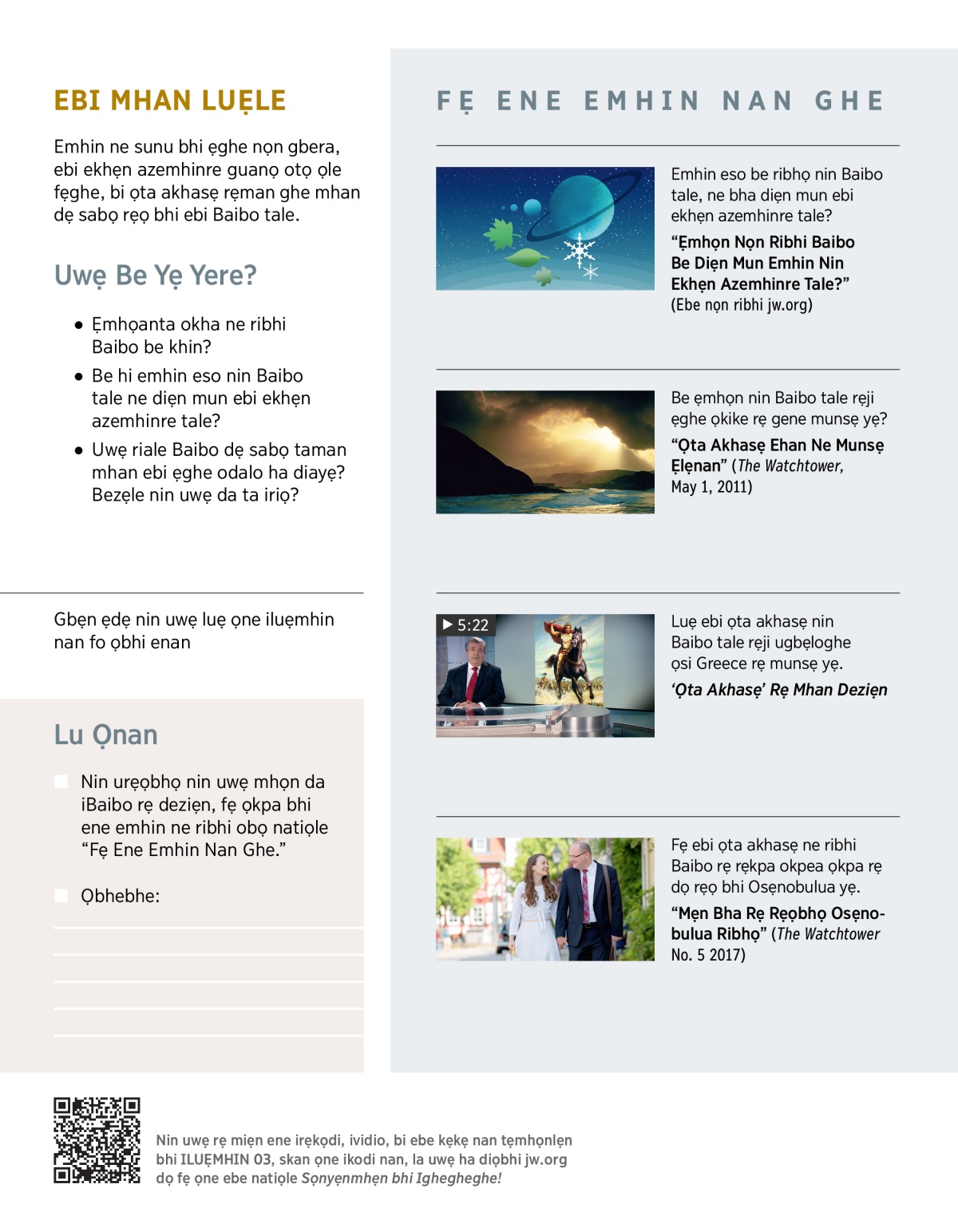 “Ẹmhọn Nọn Ribhi Baibo Be Diẹn Mun Emhin Nin Ekhẹn Azemhinre Tale?” (Ebe nọn ribhi jw.org)