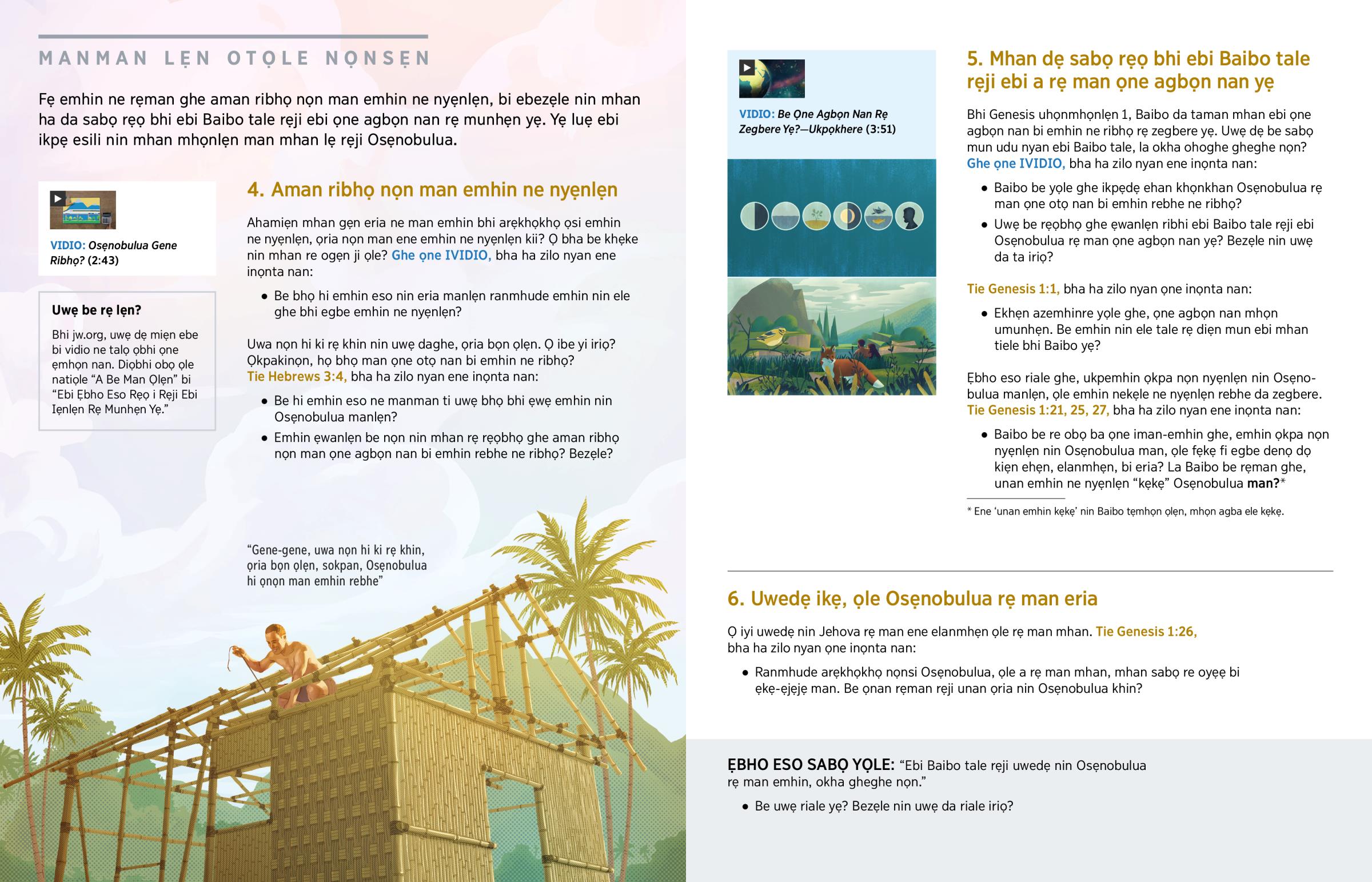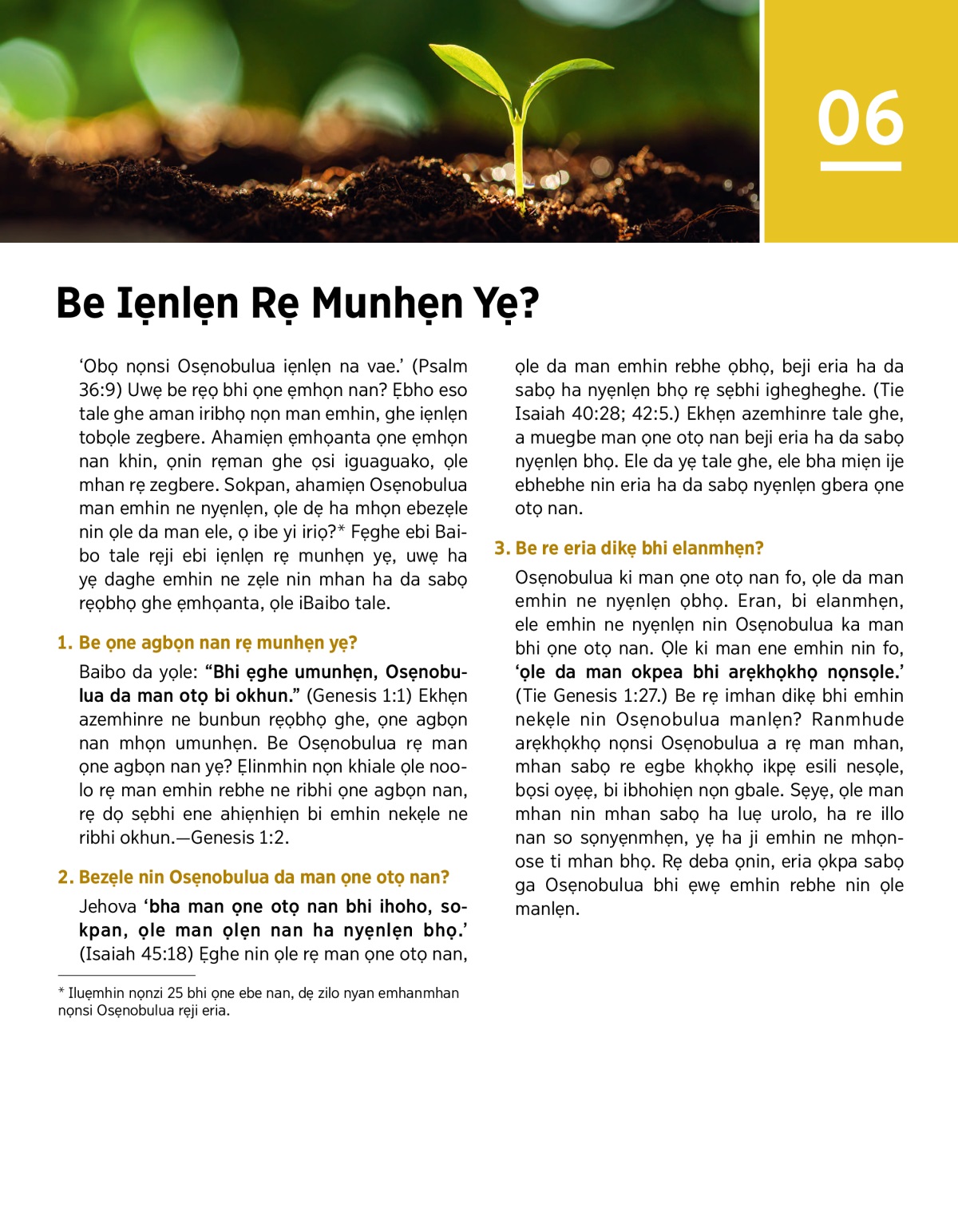 Fẹ emhin ne rẹman ghe aman ribhọ nọn man emhin ne nyẹnlẹn, bi ebezẹle nin mhan ha da sabọ rẹọ bhi ebi Baibo tale rẹji ebi ọne agbọn nan rẹ munhẹn yẹ. Yẹ luẹ ebi ikpẹ esili nin mhan mhọnlẹn man mhan lẹ rẹji Osẹnobulua.