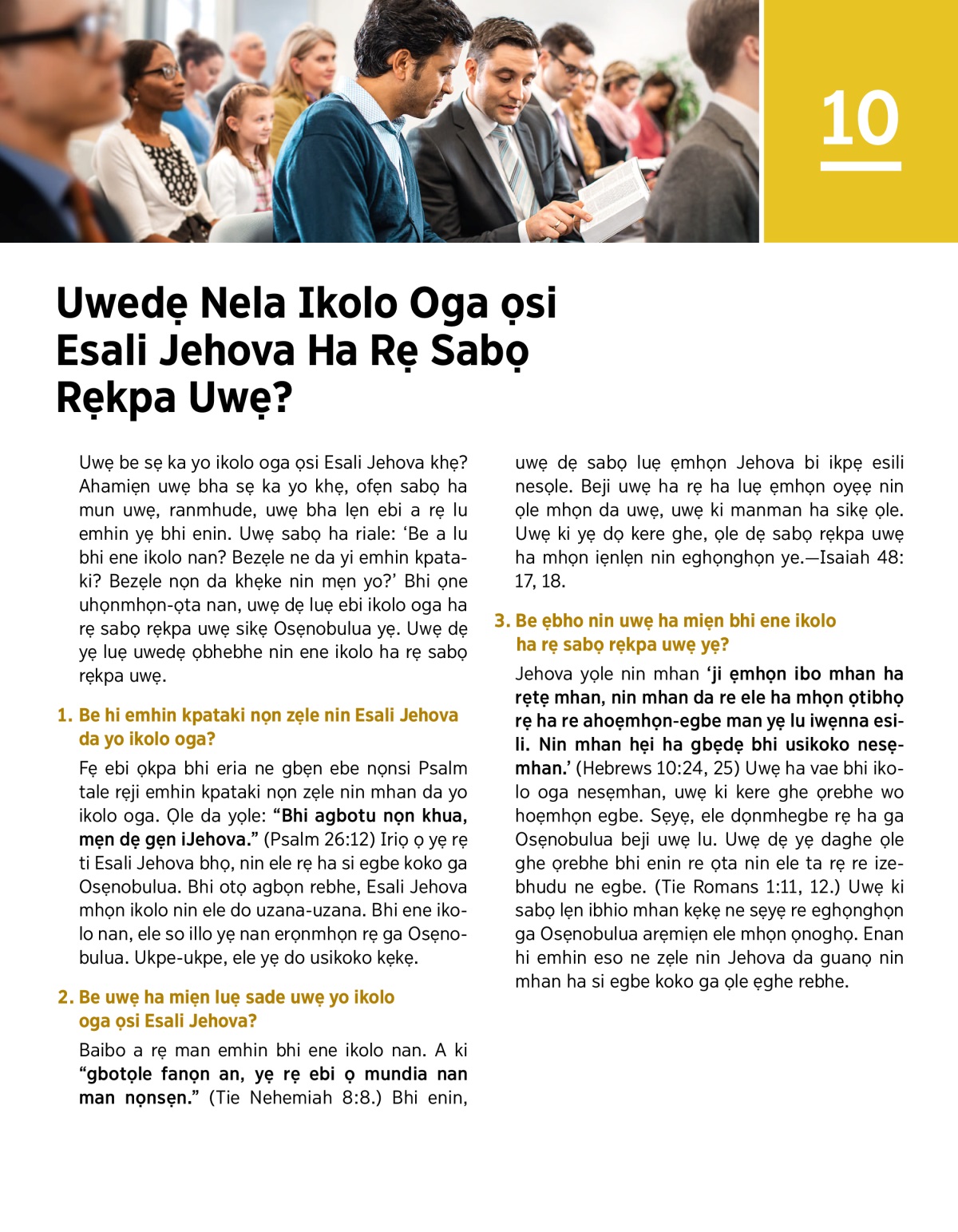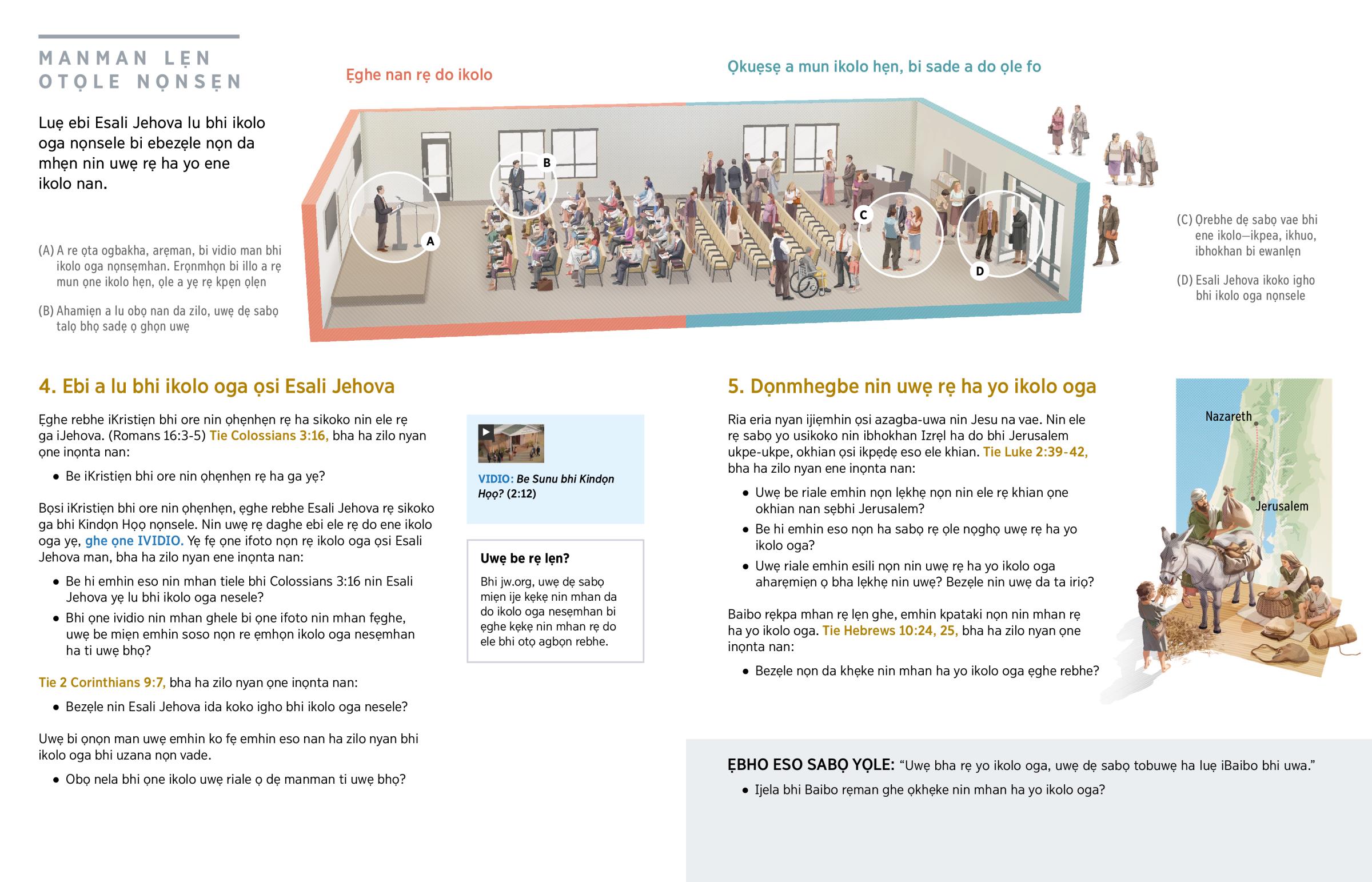 Uwẹ be sẹ ka yo ikolo oga ọsi Esali Jehova khẹ? Ahamiẹn uwẹ bha sẹ ka yo khẹ, ofẹn sabọ ha mun uwẹ, ranmhude, uwẹ bha lẹn ebi a rẹ lu emhin yẹ bhi enin. Uwẹ sabọ ha riale: ‘Be a lu bhi ene ikolo nan? Bezẹle ne da yi emhin kpataki? Bezẹle nọn da khẹke nin mẹn yo?’ Bhi ọne uhọnmhọn-ọta nan, uwẹ dẹ luẹ ebi ikolo oga ha rẹ sabọ rẹkpa uwẹ sikẹ Osẹnobulua yẹ. Uwẹ dẹ yẹ luẹ uwedẹ ọbhebhe nin ene ikolo ha rẹ sabọ rẹkpa uwẹ.