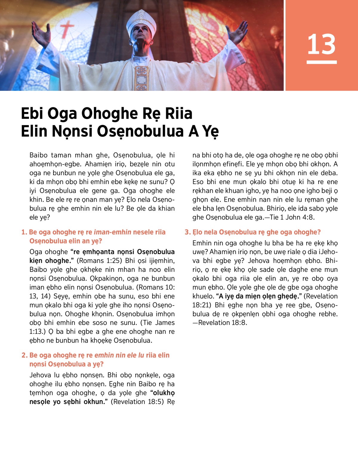 Oga ohoghe “re ẹmhọanta nọnsi Osẹnobulua kiẹn ohoghe.” (Romans 1:25) Bhi ọsi ijiẹmhin, Baibo yọle ghe ọkhẹke nin mhan ha noo elin nọnsi Osẹnobulua. Ọkpakinọn, oga ne bunbun iman ẹbho elin nọnsi Osẹnobulua. (Romans 10:13, 14) Sẹyẹ, emhin ọbe ha sunu, eso bhi ene mun ọkalo bhi oga ki yọle ghe iho nọnsi Osẹnobulua nọn. Ohoghe khọnin. Osẹnobulua imhọn obọ bhi emhin ebe soso ne sunu. (Tie James 1:13.) Ọ ba bhi egbe a ghe ene ohoghe nan re ẹbho ne bunbun ha khọẹkẹ Osẹnobulua.