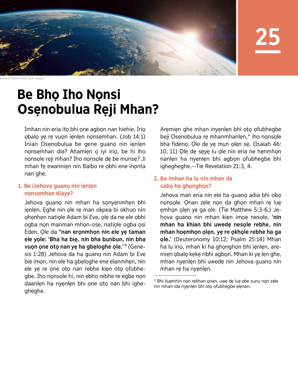 Imhan nin eria itọ bhi ọne agbọn nan hiehie. Iriọ ọbalọ yẹ rẹ vuọn iẹnlẹn nọnsẹmhan. (Job 14:1) Inian Osẹnobulua be gene guanọ nin iẹnlẹn nọnsẹmhan dia? Ahamiẹn ọ iyi iriọ, be hi iho nọnsọle rẹji mhan? Iho nọnsọle dẹ be munsẹ? Ji mhan fẹ ewanniẹn nin Baibo re ọbhi ene inọnta nan ghe.