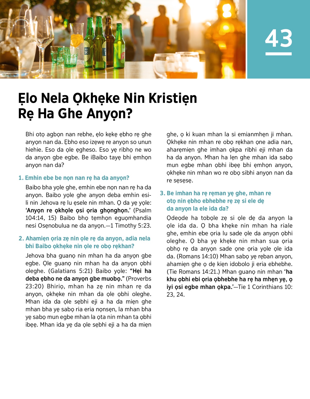 Jehova bha guanọ nin mhan ha da anyọn gbe egbe. Ọle guanọ nin mhan ha da anyọn ọbhi oleghe. (Galatians 5:21) Baibo yọle: “Hẹi ha deba ẹbho ne da anyọn gbe muobọ.” (Proverbs 23:20) Bhiriọ, mhan ha zẹ nin mhan rẹ da anyọn, ọkhẹke nin mhan da ọle ọbhi oleghe. Mhan ida da ọle sẹbhi eji a ha da miẹn ghe mhan bha yẹ sabọ ria eria nọnsẹn, la mhan bha yẹ sabọ mun egbe mhan la ọta nin mhan ta ọbhi ibẹẹ. Mhan ida yẹ da ọle sẹbhi eji a ha da miẹn ghe, ọ ki kuan mhan la si emianmhẹn ji mhan. Ọkhẹke nin mhan re obọ rẹkhan ọne adia nan, aharẹmiẹn ghe imhan ọkpa ribhi eji mhan da ha da anyọn. Mhan ha lẹn ghe mhan ida sabọ mun egbe mhan ọbhi ibẹẹ bhi ẹmhọn anyọn, ọkhẹke nin mhan wo re obọ sibhi anyọn nan da re sẹsẹsẹ.