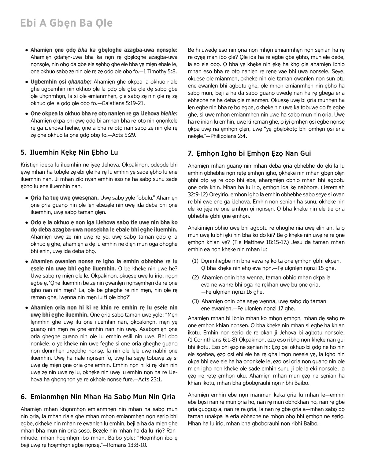Ahamiẹn emhin ebe nọn manman kaka ọria lu mhan le—emhin ebe bọsi nan rẹ mun ọria ho, nan rẹ mun obhokhan ho, nan rẹ gbe ọria guọguọ a, nan rẹ ra ọria, la nan rẹ gbe ọria a—mhan sabọ dọ taman unakpa la eria ebhebhe ne mhọn obọ bhi ẹmhọn ne sẹriọ. Mhan ha lu iriọ, mhan bha gbobọrauhi nọn ribhi Baibo.