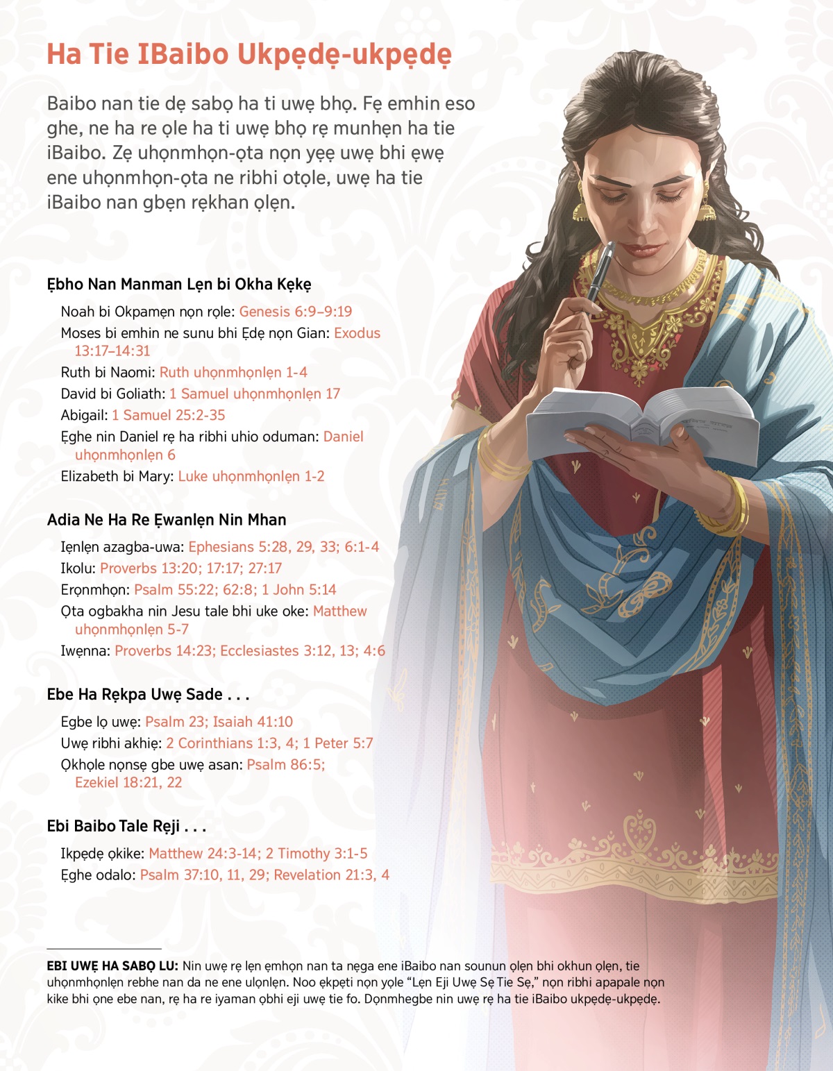 EBI UWẸ HA SABỌ LU: Nin uwẹ rẹ lẹn ẹmhọn nan ta nẹga ene iBaibo nan sounun ọlẹn bhi okhun ọlẹn, tie uhọnmhọnlẹn rebhe nan da ne ene ulọnlẹn. Noo ẹkpẹti nọn yọle “Lẹn Eji Uwẹ Sẹ Tie Sẹ,” nọn ribhi apapale nọn kike bhi ọne ebe nan, rẹ ha re iyaman ọbhi eji uwẹ tie fo. Dọnmhegbe nin uwẹ rẹ ha tie iBaibo ukpẹdẹ-ukpẹdẹ.