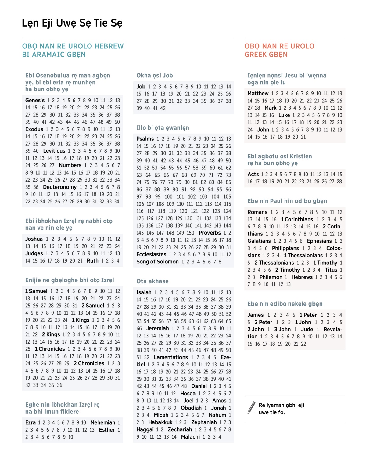 Lẹn Eji Uwẹ Sẹ Tie Sẹ Ebi Ọnan Print Dia Yẹ Ebi Osẹnobulua rẹ man agbọn yẹ, bi ebi eria rẹ munhẹn ha bun ọbhọ yẹ Ebi ibhokhan Izrẹl rẹ nabhi otọ nan ve nin ele yẹ Enijie ne gbẹloghe bhi otọ Izrẹl Ẹghe nin ibhokhan Izrẹl rẹ na bhi imun fikiere Okha ọsi Job Illo bi ọta ẹwanlẹn Ọta akhasẹ Iẹnlẹn nọnsi Jesu bi iwẹnna oga nin ọle lu Ebi agbotu ọsi Kristiẹn rẹ ha bun ọbhọ yẹ Ebe nin Paul nin odibo gbẹn Ebe nin edibo nekẹle gbẹn Re iyaman ọbhi eji uwẹ tie fo. OBỌ NAN RE UROLO HEBREW BI ARAMAIC GBẸN Ebi Osẹnobulua rẹ man agbọn yẹ, bi ebi eria rẹ munhẹn ha bun ọbhọ yẹ Genesis 1 2 3 4 5 6 7 8 9 10 11 12 13 14 15 16 17 18 19 20 21 22 23 24 25 26 27 28 29 30 31 32 33 34 35 36 37 38 39 40 41 42 43 44 45 46 47 48 49 50 Exodus 1 2 3 4 5 6 7 8 9 10 11 12 13 14 15 16 17 18 19 20 21 22 23 24 25 26 27 28 29 30 31 32 33 34 35 36 37 38 39 40 Leviticus 1 2 3 4 5 6 7 8 9 10 11 12 13 14 15 16 17 18 19 20 21 22 23 24 25 26 27 Numbers 1 2 3 4 5 6 7 8 9 10 11 12 13 14 15 16 17 18 19 20 21 22 23 24 25 26 27 28 29 30 31 32 33 34 35 36 Deuteronomy 1 2 3 4 5 6 7 8 9 10 11 12 13 14 15 16 17 18 19 20 21 22 23 24 25 26 27 28 29 30 31 32 33 34 Ebi ibhokhan Izrẹl rẹ nabhi otọ nan ve nin ele yẹ Joshua 1 2 3 4 5 6 7 8 9 10 11 12 13 14 15 16 17 18 19 20 21 22 23 24 Judges 1 2 3 4 5 6 7 8 9 10 11 12 13 14 15 16 17 18 19 20 21 Ruth 1 2 3 4 Enijie ne gbẹloghe bhi otọ Izrẹl 1 Samuel 1 2 3 4 5 6 7 8 9 10 11 12 13 14 15 16 17 18 19 20 21 22 23 24 25 26 27 28 29 30 31 2 Samuel 1 2 3 4 5 6 7 8 9 10 11 12 13 14 15 16 17 18 19 20 21 22 23 24 1 Kings 1 2 3 4 5 6 7 8 9 10 11 12 13 14 15 16 17 18 19 20 21 22 2 Kings 1 2 3 4 5 6 7 8 9 10 11 12 13 14 15 16 17 18 19 20 21 22 23 24 25 1 Chronicles 1 2 3 4 5 6 7 8 9 10 11 12 13 14 15 16 17 18 19 20 21 22 23 24 25 26 27 28 29 2 Chronicles 1 2 3 4 5 6 7 8 9 10 11 12 13 14 15 16 17 18 19 20 21 22 23 24 25 26 27 28 29 30 31 32 33 34 35 36 Ẹghe nin ibhokhan Izrẹl rẹ na bhi imun fikieree Ezra 1 2 3 4 5 6 7 8 9 10 Nehemiah 1 2 3 4 5 6 7 8 9 10 11 12 13 Esther 1 2 3 4 5 6 7 8 9 10 Okha ọsi Job Job 1 2 3 4 5 6 7 8 9 10 11 12 13 14 15 16 17 18 19 20 21 22 23 24 25 26 27 28 29 30 31 32 33 34 35 36 37 38 39 40 41 42 Illo bi ọta ẹwanlẹn Psalms 1 2 3 4 5 6 7 8 9 10 11 12 13 14 15 16 17 18 19 20 21 22 23 24 25 26 27 28 29 30 31 32 33 34 35 36 37 38 39 40 41 42 43 44 45 46 47 48 49 50 51 52 53 54 55 56 57 58 59 60 61 62 63 64 65 66 67 68 69 70 71 72 73 74 75 76 77 78 79 80 81 82 83 84 85 86 87 88 89 90 91 92 93 94 95 96 97 98 99 100 101 102 103 104 105 106 107 108 109 110 111 112 113 114 115 116 117 118 119 120 121 122 123 124 125 126 127 128 129 130 131 132 133 134 135 136 137 138 139 140 141 142 143 144 145 146 147 148 149 150 Proverbs 1 2 3 4 5 6 7 8 9 10 11 12 13 14 15 16 17 18 19 20 21 22 23 24 25 26 27 28 29 30 31 Ecclesiastes 1 2 3 4 5 6 7 8 9 10 11 12 Song of Solomon 1 2 3 4 5 6 7 8 Ọta akhasẹ Isaiah 1 2 3 4 5 6 7 8 9 10 11 12 13 14 15 16 17 18 19 20 21 22 23 24 25 26 27 28 29 30 31 32 33 34 35 36 37 38 39 40 41 42 43 44 45 46 47 48 49 50 51 52 53 54 55 56 57 58 59 60 61 62 63 64 65 66 Jeremiah 1 2 3 4 5 6 7 8 9 10 11 12 13 14 15 16 17 18 19 20 21 22 23 24 25 26 27 28 29 30 31 32 33 34 35 36 37 38 39 40 41 42 43 44 45 46 47 48 49 50 51 52 Lamentations 1 2 3 4 5 Ezekiel 1 2 3 4 5 6 7 8 9 10 11 12 13 14 15 16 17 18 19 20 21 22 23 24 25 26 27 28 29 30 31 32 33 34 35 36 37 38 39 40 41 42 43 44 45 46 47 48 Daniel 1 2 3 4 5 6 7 8 9 10 11 12 Hosea 1 2 3 4 5 6 7 8 9 10 11 12 13 14 Joel 1 2 3 Amos 1 2 3 4 5 6 7 8 9 Obadiah 1 Jonah 1 2 3 4 Micah 1 2 3 4 5 6 7 Nahum 1 2 3 Habakkuk 1 2 3 Zephaniah 1 2 3 Haggai 1 2 Zechariah 1 2 3 4 5 6 7 8 9 10 11 12 13 14 Malachi 1 2 3 4 OBỌ NAN RE UROLO GREEK GBẸN Iẹnlẹn nọnsi Jesu bi iwẹnna oga nin ọle lu Matthew 1 2 3 4 5 6 7 8 9 10 11 12 13 14 15 16 17 18 19 20 21 22 23 24 25 26 27 28 Mark 1 2 3 4 5 6 7 8 9 10 11 12 13 14 15 16 Luke 1 2 3 4 5 6 7 8 9 10 11 12 13 14 15 16 17 18 19 20 21 22 23 24 John 1 2 3 4 5 6 7 8 9 10 11 12 13 14 15 16 17 18 19 20 21 Ebi agbotu ọsi Kristiẹn rẹ ha bun ọbhọ yẹ Acts 1 2 3 4 5 6 7 8 9 10 11 12 13 14 15 16 17 18 19 20 21 22 23 24 25 26 27 28 Ebe nin Paul nin odibo gbẹn Romans 1 2 3 4 5 6 7 8 9 10 11 12 13 14 15 16 1 Corinthians 1 2 3 4 5 6 7 8 9 10 11 12 13 14 15 16 2 Corinthians 1 2 3 4 5 6 7 8 9 10 11 12 13 Galatians 1 2 3 4 5 6 Ephesians 1 2 3 4 5 6 Philippians 1 2 3 4 Colossians 1 2 3 4 1 Thessalonians 1 2 3 4 5 2 Thessalonians 1 2 3 1 Timothy 1 2 3 4 5 6 2 Timothy 1 2 3 4 Titus 1 2 3 Philemon 1 Hebrews 1 2 3 4 5 6 7 8 9 10 11 12 13 Ebe nin edibo nekẹle gbẹn James 1 2 3 4 5 1 Peter 1 2 3 4 5 2 Peter 1 2 3 1 John 1 2 3 4 5 2 John 1 3 John 1 Jude 1 Revelation 1 2 3 4 5 6 7 8 9 10 11 12 13 14 15 16 17 18 19 20 21 22