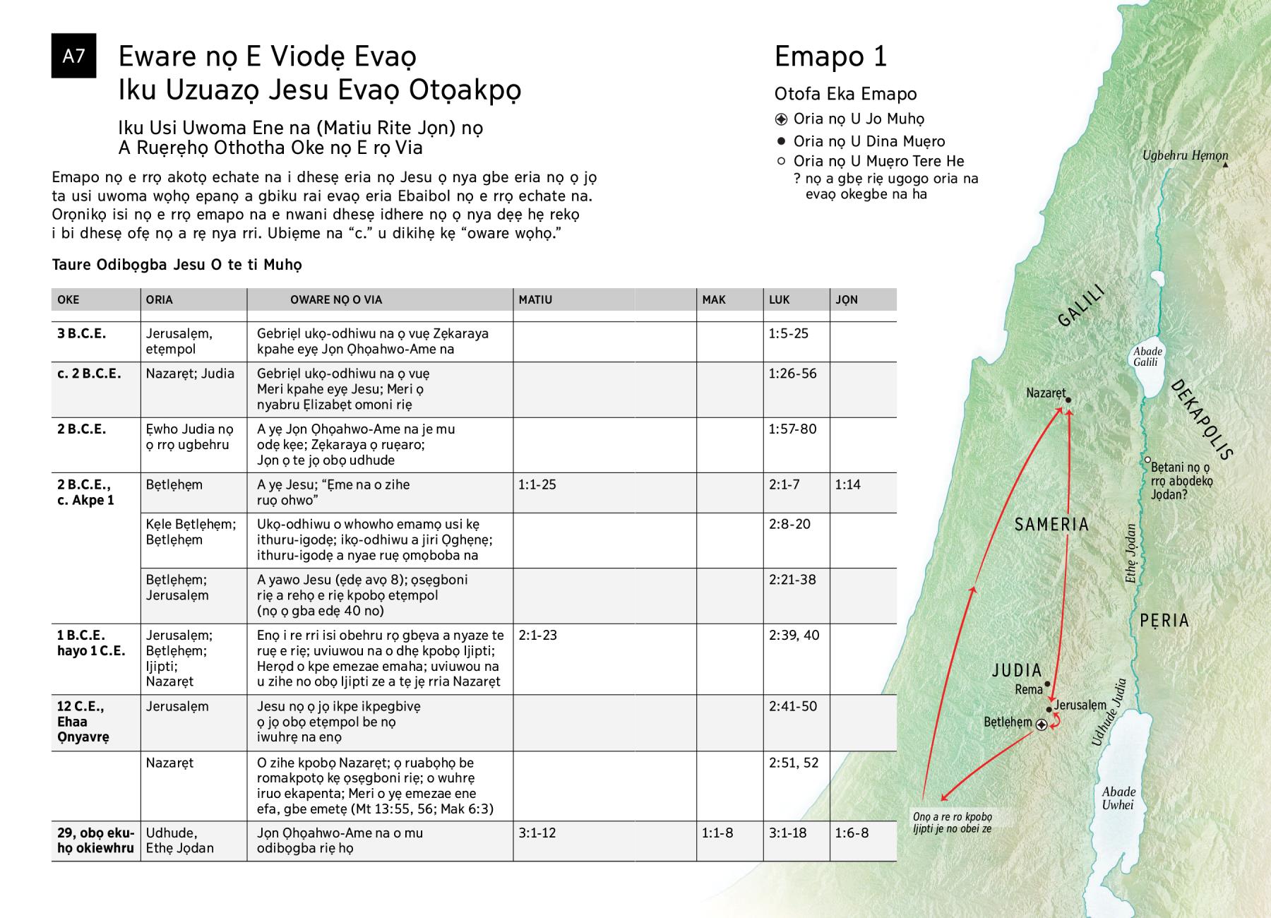Emapo nọ e rrọ akotọ echate na i dhesẹ eria nọ Jesu ọ nya gbe eria nọ ọ jọ ta usi uwoma wọhọ epanọ a gbiku rai evaọ eria Ebaibol nọ e rrọ echate na. Orọnikọ isi nọ e rrọ emapo na e nwani dhesẹ idhere nọ ọ nya dẹẹ hẹ rekọ i bi dhesẹ ofẹ nọ a rẹ nya rri. Ubiẹme na “c.” u dikihẹ kẹ “oware wọhọ.”