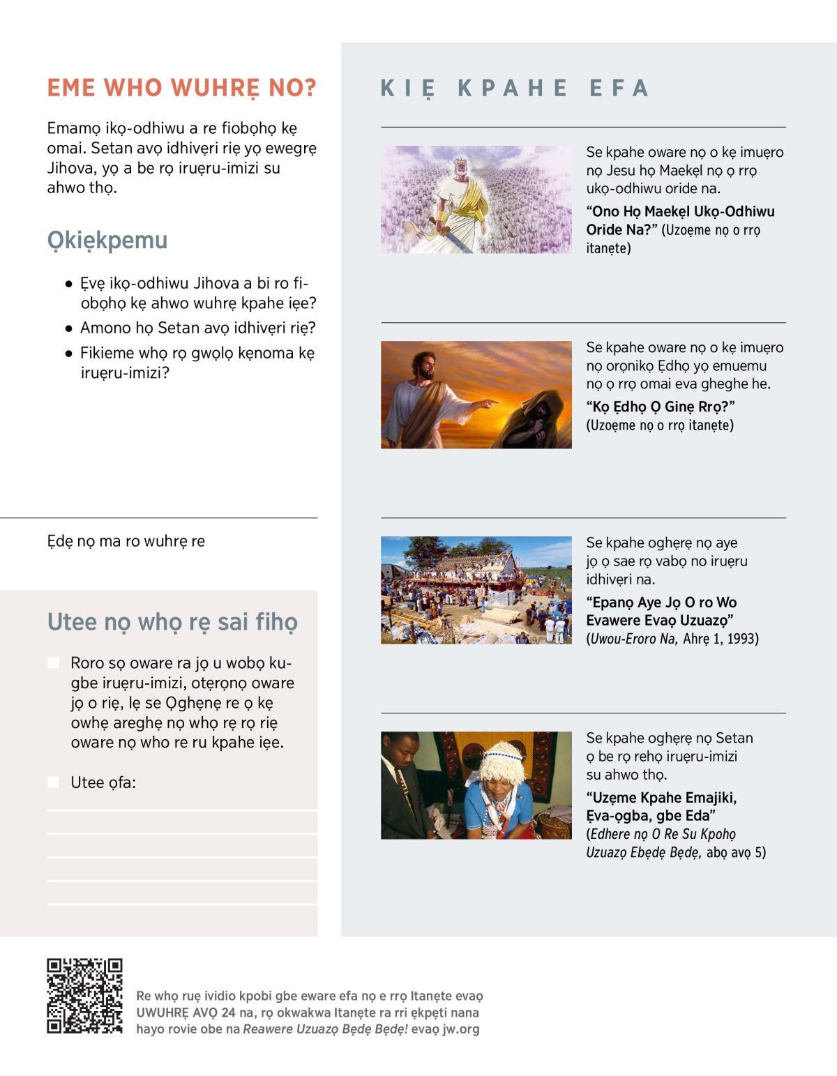Emamọ ikọ-odhiwu a re fiobọhọ kẹ omai. Setan avọ idhivẹri riẹ yọ ewegrẹ Jihova, yọ a be rọ iruẹru-imizi su ahwo thọ.
