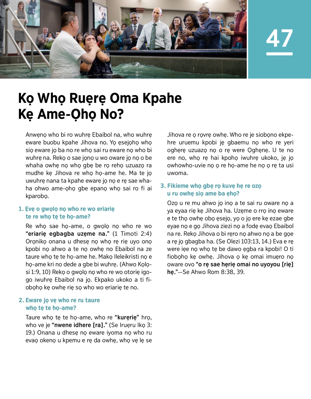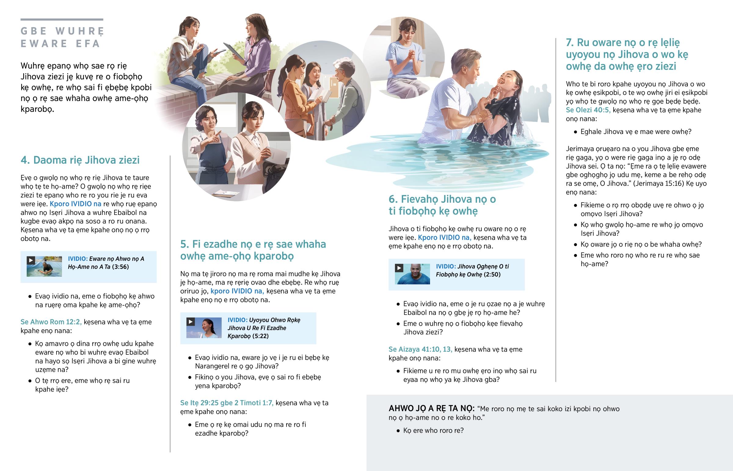 Nọ ma tẹ jiroro nọ ma rẹ roma mai mudhe kẹ Jihova jẹ họ-ame, ma rẹ rẹriẹ ovao dhe ebẹbẹ. Re whọ ruẹ oriruo jọ, kporo IVIDIO na, kẹsena wha vẹ ta ẹme kpahe enọ nọ e rrọ obotọ na.