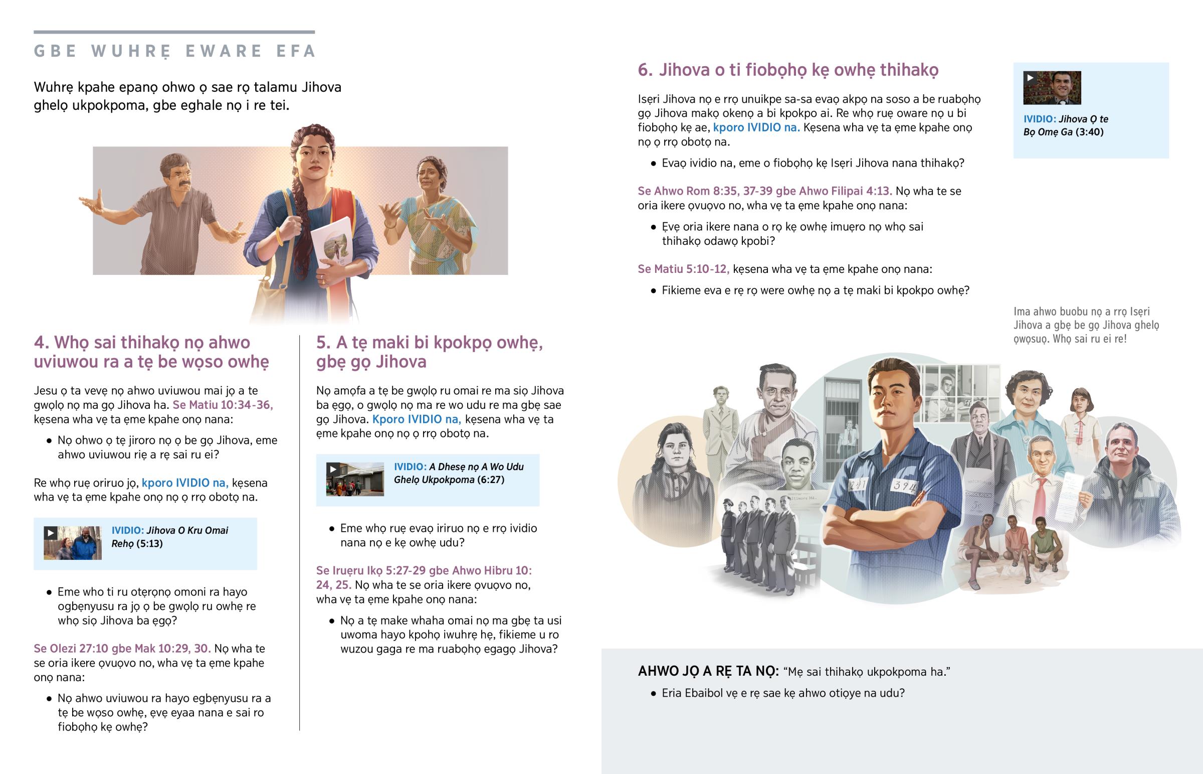 O gwọlọ nọ ma rẹ rẹroso Jihova gaga enẹna. Wo oke nọ whọ rẹ rọ lẹ se Jihova kẹdẹ kẹdẹ je se oria jọ evaọ Ebaibol na. Hai kpohọ iwuhrẹ ukoko kẹse kẹse. Who te bi ru eware nana who ti wo ẹgba nọ whọ sai ro thihakọ ukpokpoma kpobi ududu, o tẹ make rọnọ obọ ahwo uviuwou ra u bi no ze dede. Pọl ukọ na nọ a kpokpo gaga, o kere nọ: “Jihova họ ọnọ o bi fiobọhọ kẹ omẹ; ozọ u re mu omẹ hẹ.”—Ahwo Hibru 13:6.
