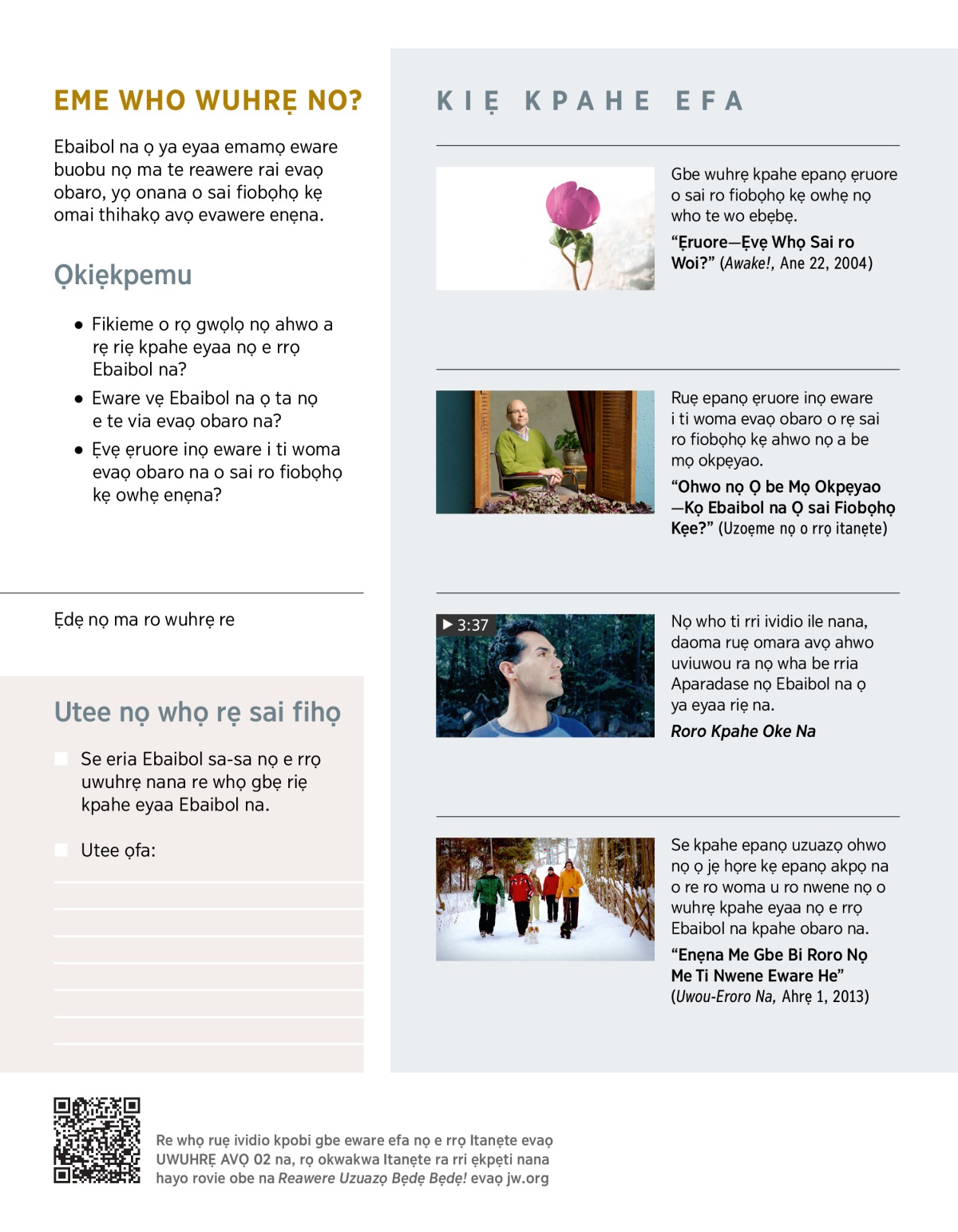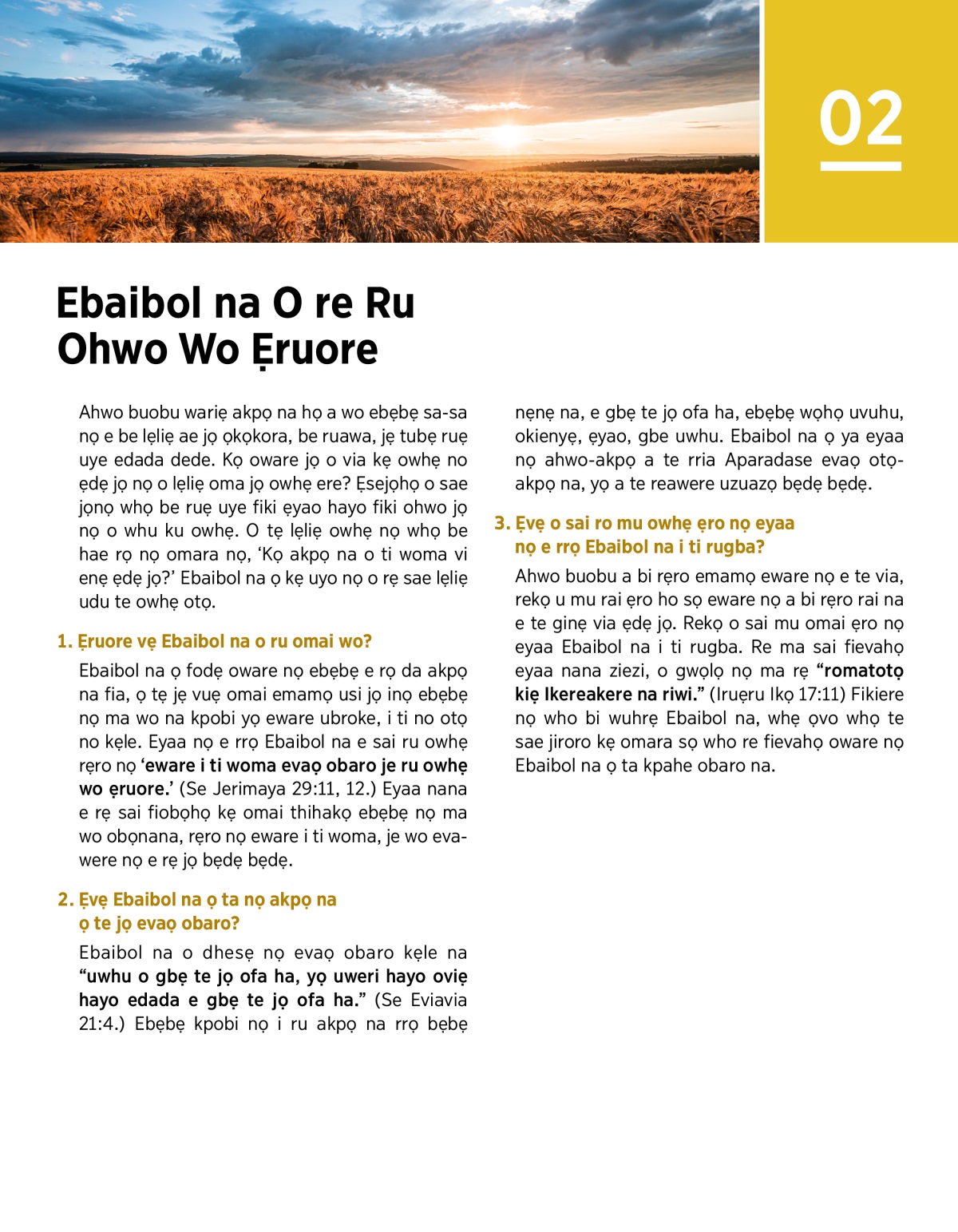 Wuhrẹ kpahe eware jọ nọ Ebaibol na ọ ya eyaa nọ e te via evaọ obaro. Jẹ ruẹ epanọ ẹruore nọ ọ rrọ Ebaibol na o bi ro fiobọhọ kẹ ahwo nẹnẹ.