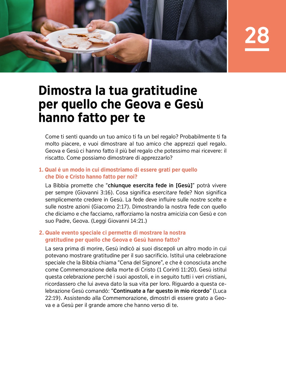 Gesù voleva che i suoi discepoli osservassero la Cena del Signore una volta all’anno, nel giorno in cui ricorre l’anniversario della sua morte. Per questo i Testimoni di Geova si riuniscono ogni anno per ricordare la morte di Cristo nel modo da lui stabilito. Per saperne di più su questo importante evento, guarda il VIDEO. Poi ragiona sulla domanda che segue.