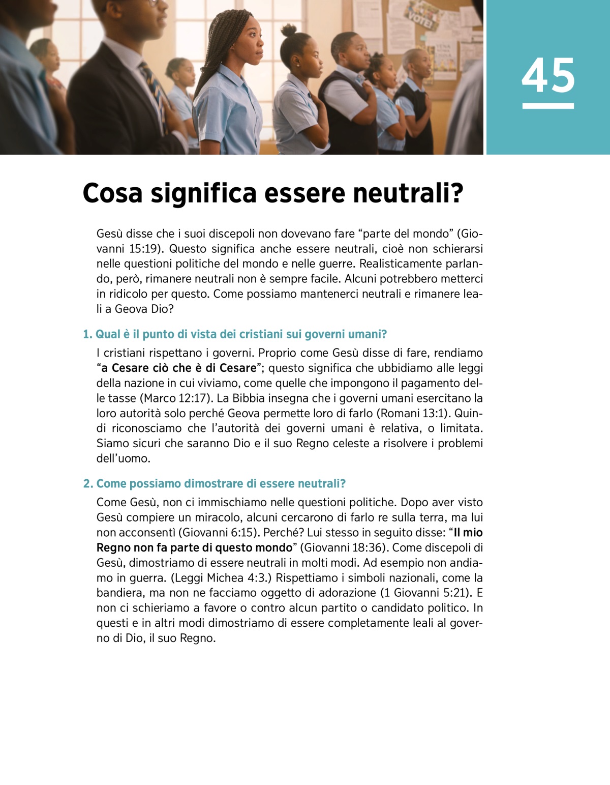 Come Gesù, non ci immischiamo nelle questioni politiche. Dopo aver visto Gesù compiere un miracolo, alcuni cercarono di farlo re sulla terra, ma lui non acconsentì (Giovanni 6:15). Perché? Lui stesso in seguito disse: “Il mio Regno non fa parte di questo mondo” (Giovanni 18:36). Come discepoli di Gesù, dimostriamo di essere neutrali in molti modi. Ad esempio non andiamo in guerra. (Leggi Michea 4:3.) Rispettiamo i simboli nazionali, come la bandiera, ma non ne facciamo oggetto di adorazione (1 Giovanni 5:21). E non ci schieriamo a favore o contro alcun partito o candidato politico. In questi e in altri modi dimostriamo di essere completamente leali al governo di Dio, il suo Regno.