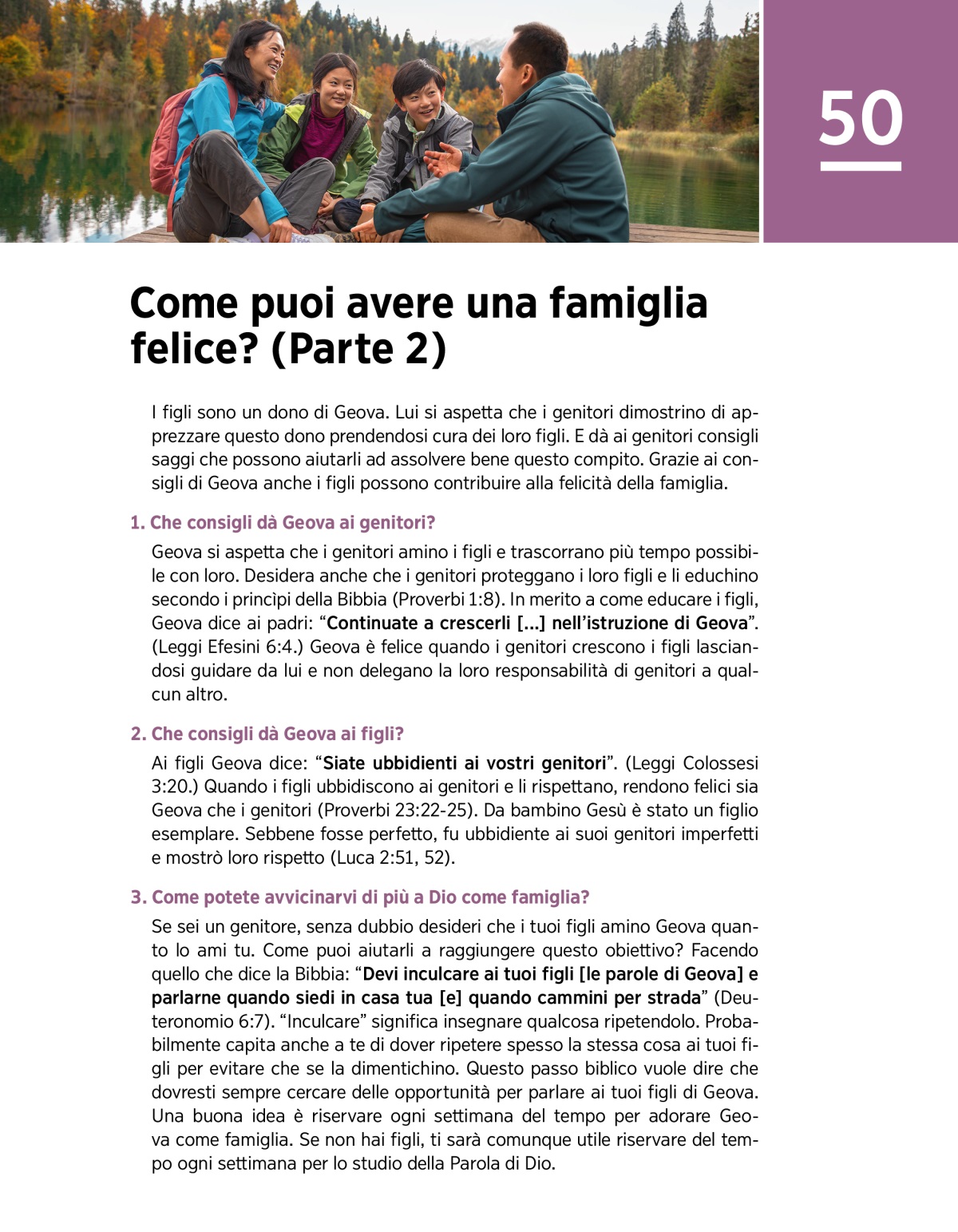 Ai figli Geova dice: “Siate ubbidienti ai vostri genitori”. (Leggi Colossesi 3:20.) Quando i figli ubbidiscono ai genitori e li rispettano, rendono felici sia Geova che i genitori (Proverbi 23:22-25). Da bambino Gesù è stato un figlio esemplare. Sebbene fosse perfetto, fu ubbidiente ai suoi genitori imperfetti e mostrò loro rispetto (Luca 2:51, 52).