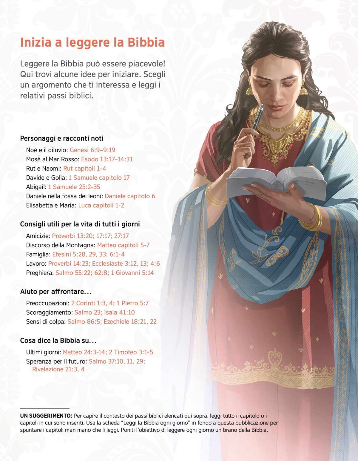 UN SUGGERIMENTO: Per capire il contesto dei passi biblici elencati qui sopra, leggi tutto il capitolo o i capitoli in cui sono inseriti. Usa la scheda “Leggi la Bibbia ogni giorno” in fondo a questa pubblicazione per spuntare i capitoli man mano che li leggi. Poniti l’obiettivo di leggere ogni giorno un brano della Bibbia.