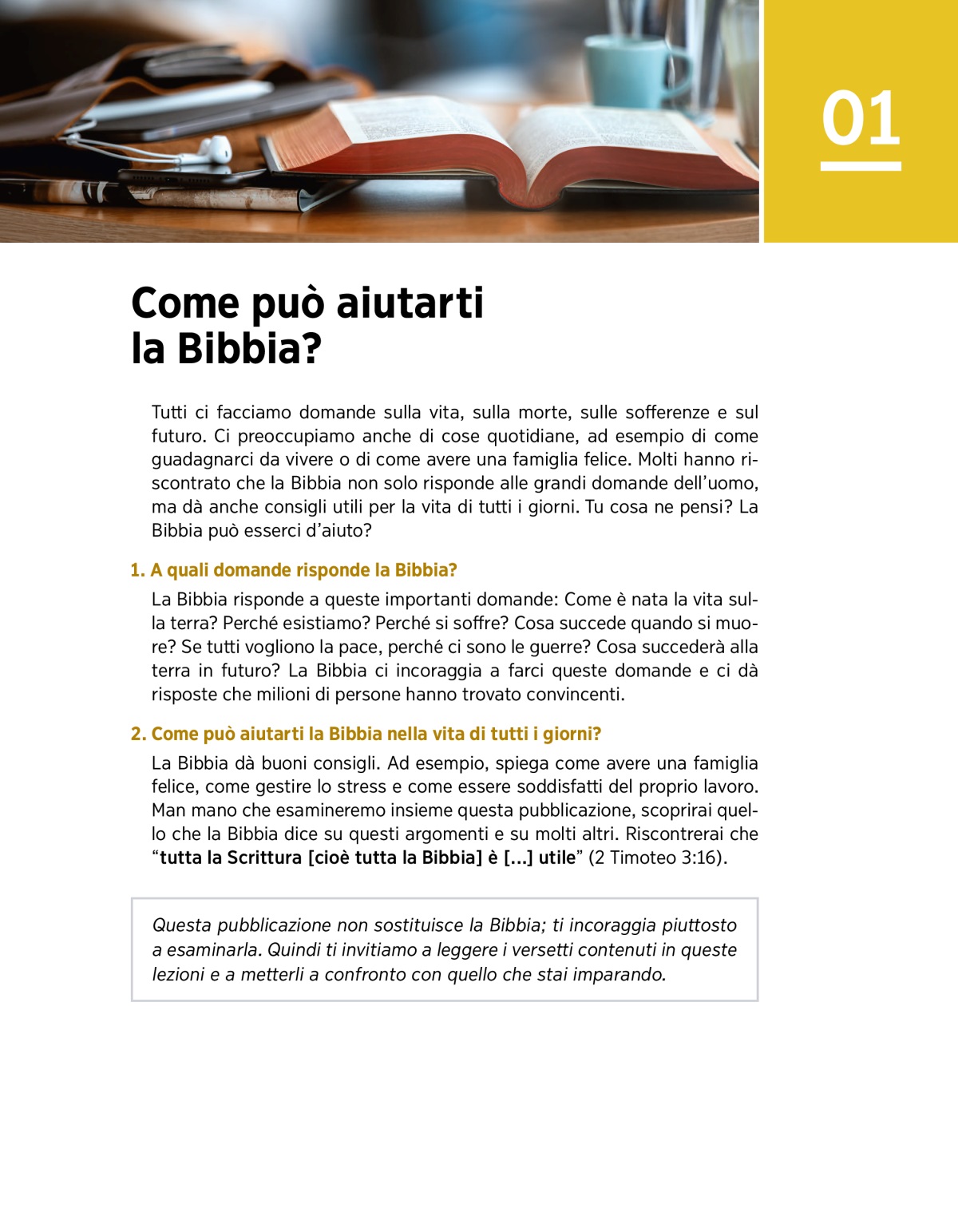 Questa pubblicazione non sostituisce la Bibbia; ti incoraggia piuttosto a esaminarla. Quindi ti invitiamo a leggere i versetti contenuti in queste lezioni e a metterli a confronto con quello che stai imparando.