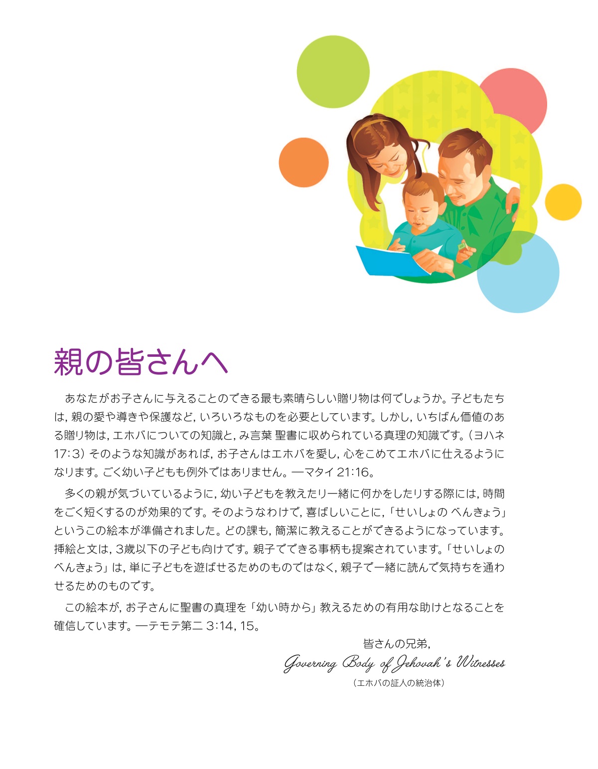 この絵本が,お子さんに聖書の真理を「幼い時から」教えるための有用な助けとなることを確信しています。―テモテ第二 3:14,15。