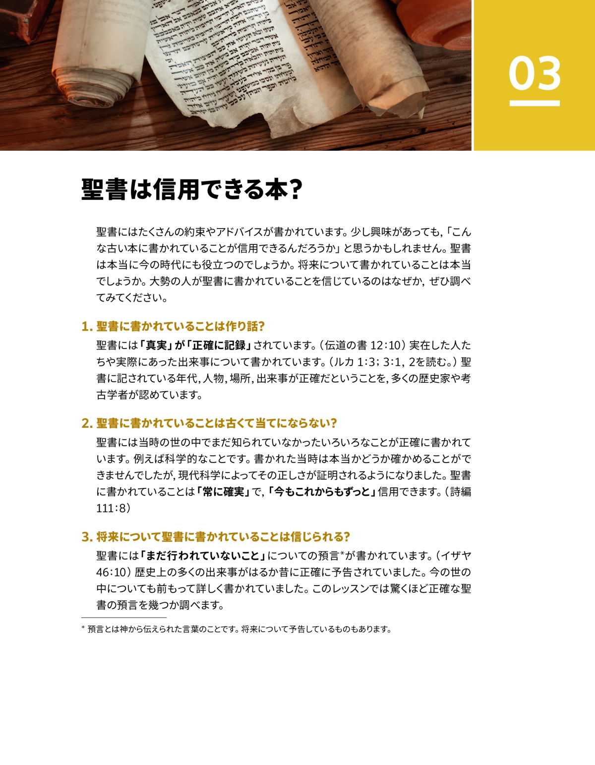 聖書にはたくさんの約束やアドバイスが書かれています。少し興味があっても,「こんな古い本に書かれていることが信用できるんだろうか」と思うかもしれません。聖書は本当に今の時代にも役立つのでしょうか。将来について書かれていることは本当でしょうか。大勢の人が聖書に書かれていることを信じているのはなぜか,ぜひ調べてみてください。