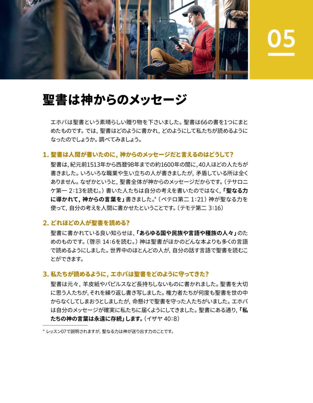 レッスン5。バスに乗っている男性が聖書を読んでいる。