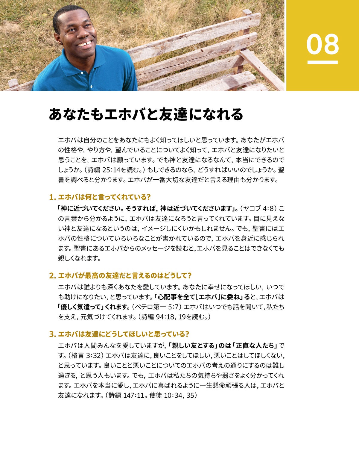 エホバは自分のことをあなたにもよく知ってほしいと思っています。あなたがエホバの性格や,やり方や,望んでいることについてよく知って,エホバと友達になりたいと思うことを,エホバは願っています。でも神と友達になるなんて,本当にできるのでしょうか。(詩編 25:14を読む。)もしできるのなら,どうすればいいのでしょうか。聖書を調べると分かります。エホバが一番大切な友達だと言える理由も分かります。