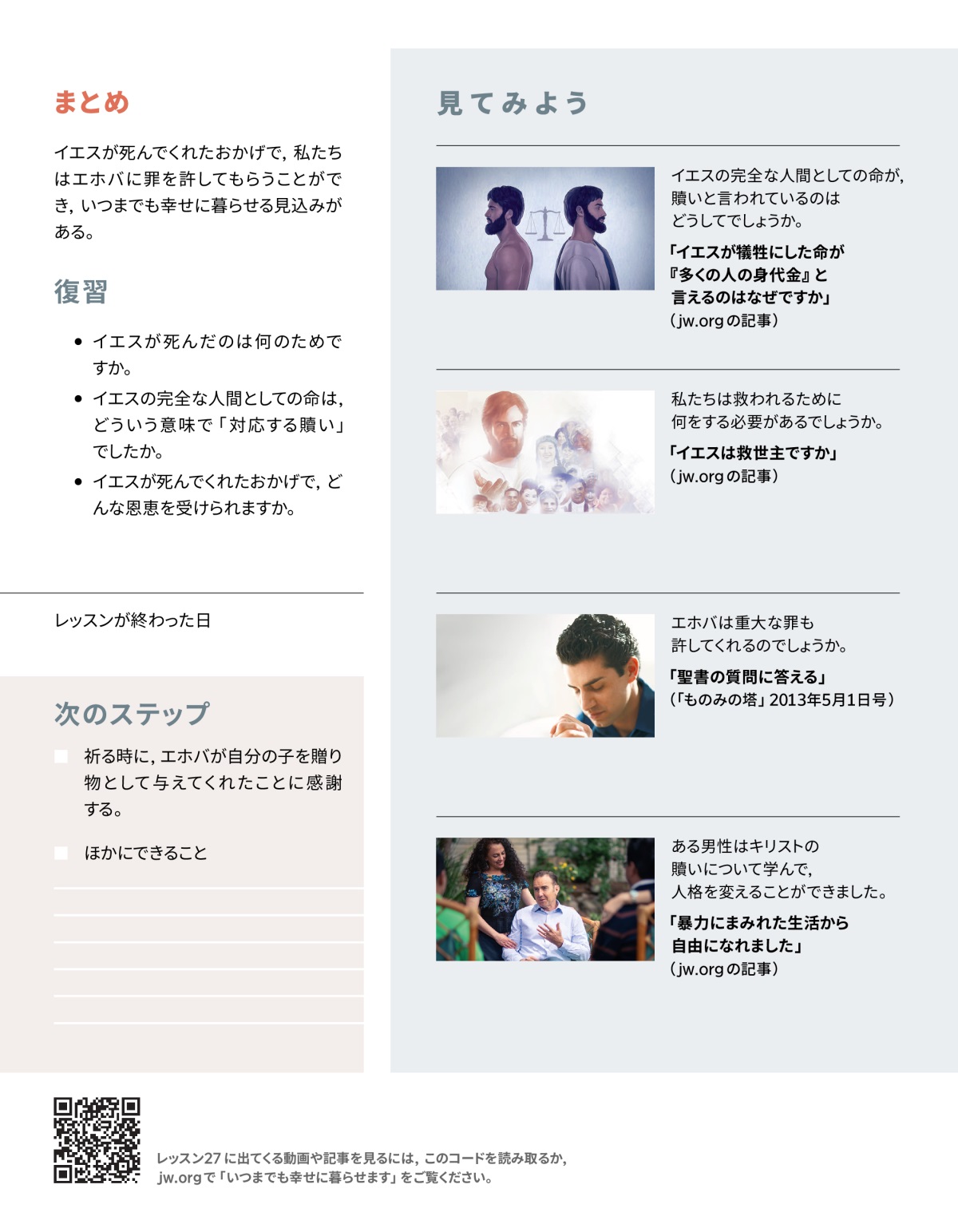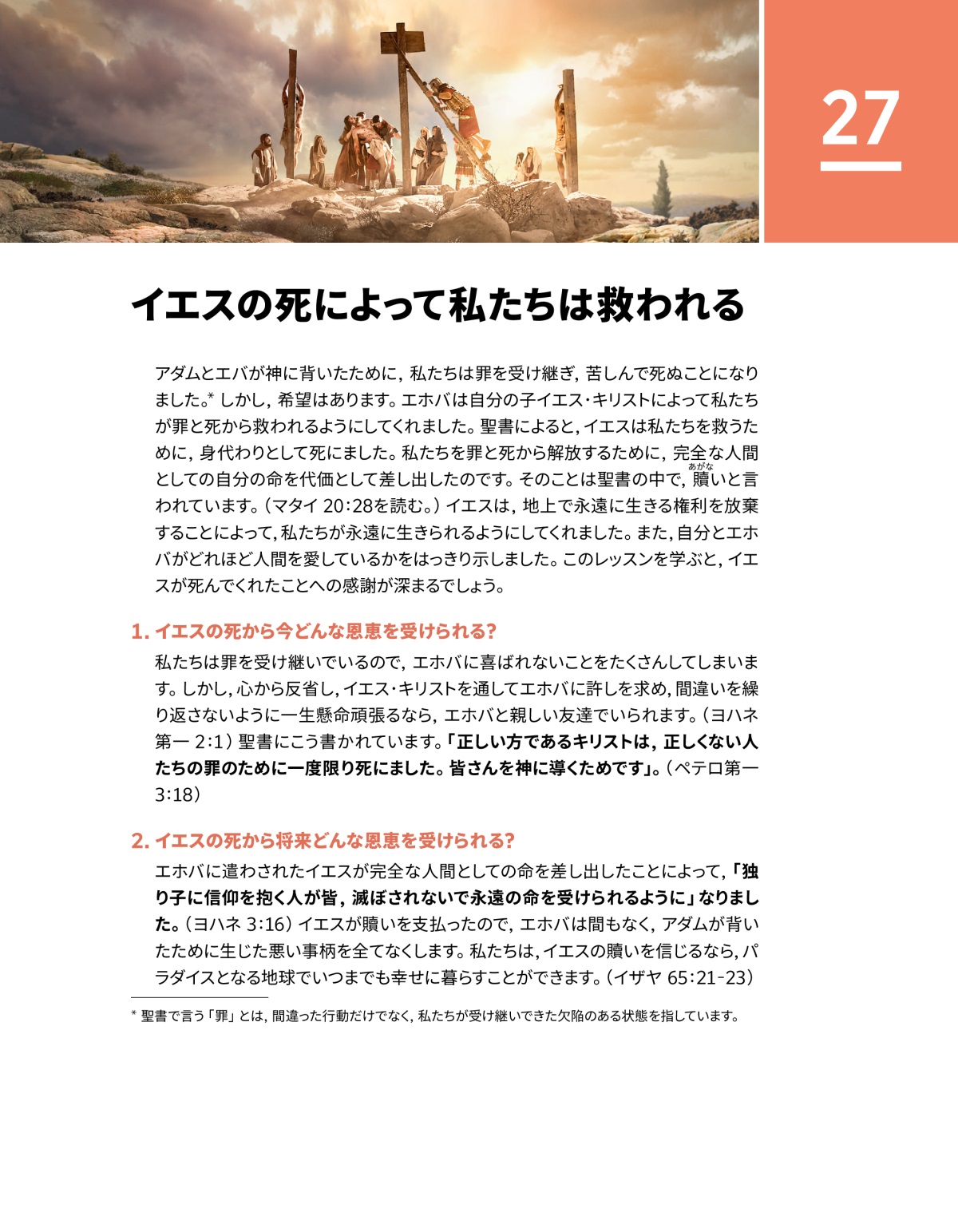 アダムとエバが神に背いたために,私たちは罪を受け継ぎ,苦しんで死ぬことになりました。a しかし,希望はあります。エホバは自分の子イエス・キリストによって私たちが罪と死から救われるようにしてくれました。聖書によると,イエスは私たちを救うために,身代わりとして死にました。私たちを罪と死から解放するために,完全な人間としての自分の命を代価として差し出したのです。そのことは聖書の中で,贖いと言われています。(マタイ 20:28を読む。)イエスは,地上で永遠に生きる権利を放棄することによって,私たちが永遠に生きられるようにしてくれました。また,自分とエホバがどれほど人間を愛しているかをはっきり示しました。このレッスンを学ぶと,イエスが死んでくれたことへの感謝が深まるでしょう。