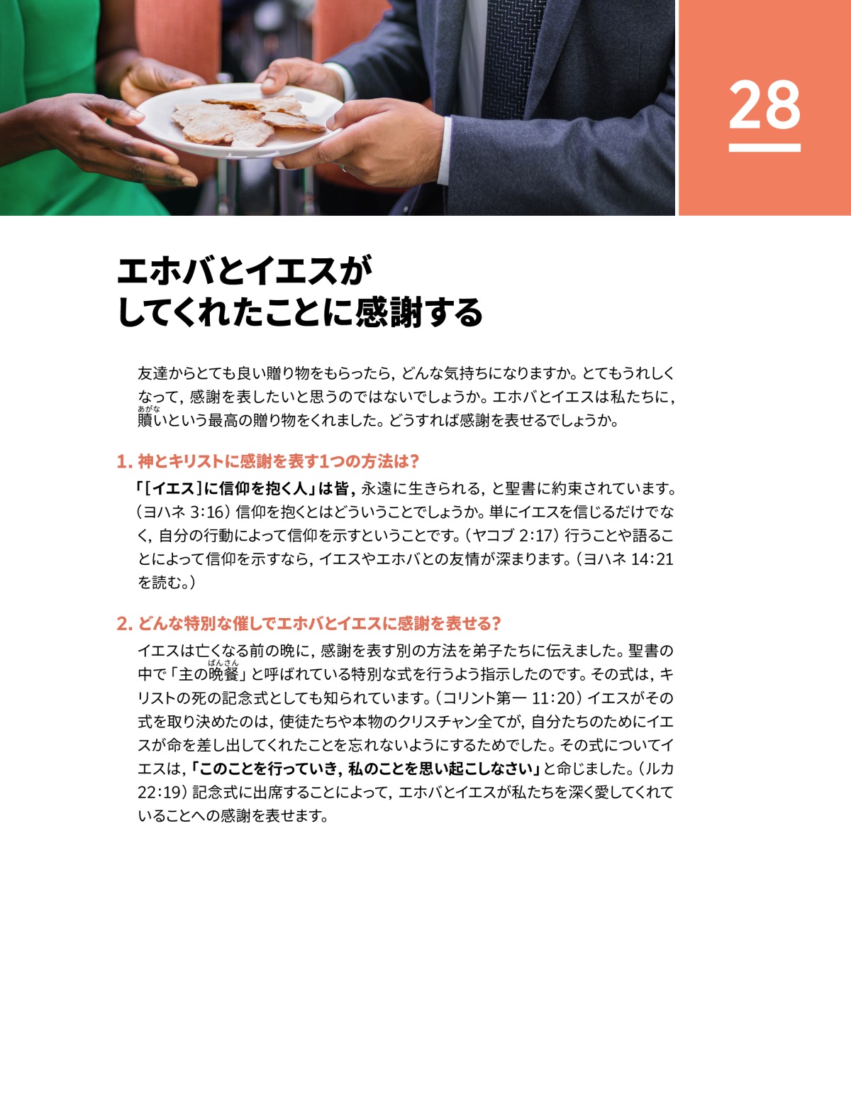 イエスは亡くなる前の晩に,感謝を表す別の方法を弟子たちに伝えました。聖書の中で「主の晩餐」と呼ばれている特別な式を行うよう指示したのです。その式は,キリストの死の記念式としても知られています。(コリント第一 11:20)イエスがその式を取り決めたのは,使徒たちや本物のクリスチャン全てが,自分たちのためにイエスが命を差し出してくれたことを忘れないようにするためでした。その式についてイエスは,「このことを行っていき,私のことを思い起こしなさい」と命じました。(ルカ 22:19)記念式に出席することによって,エホバとイエスが私たちを深く愛してくれていることへの感謝を表せます。