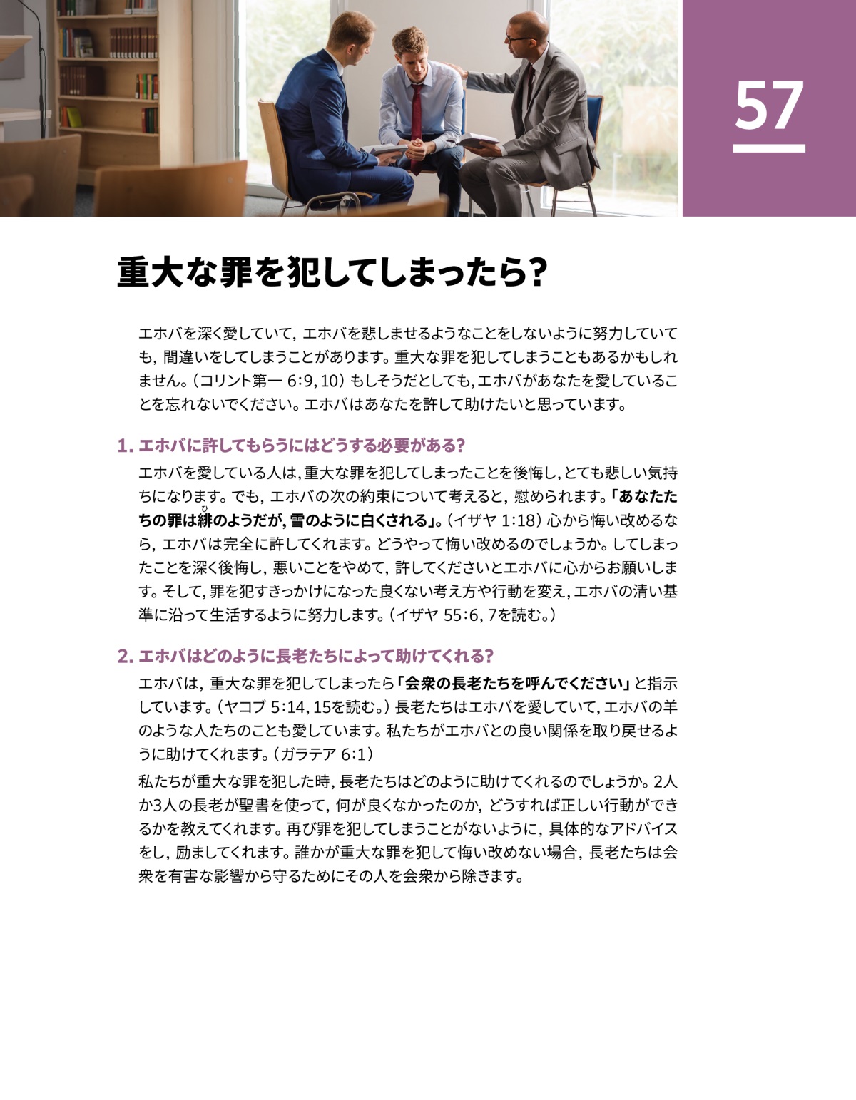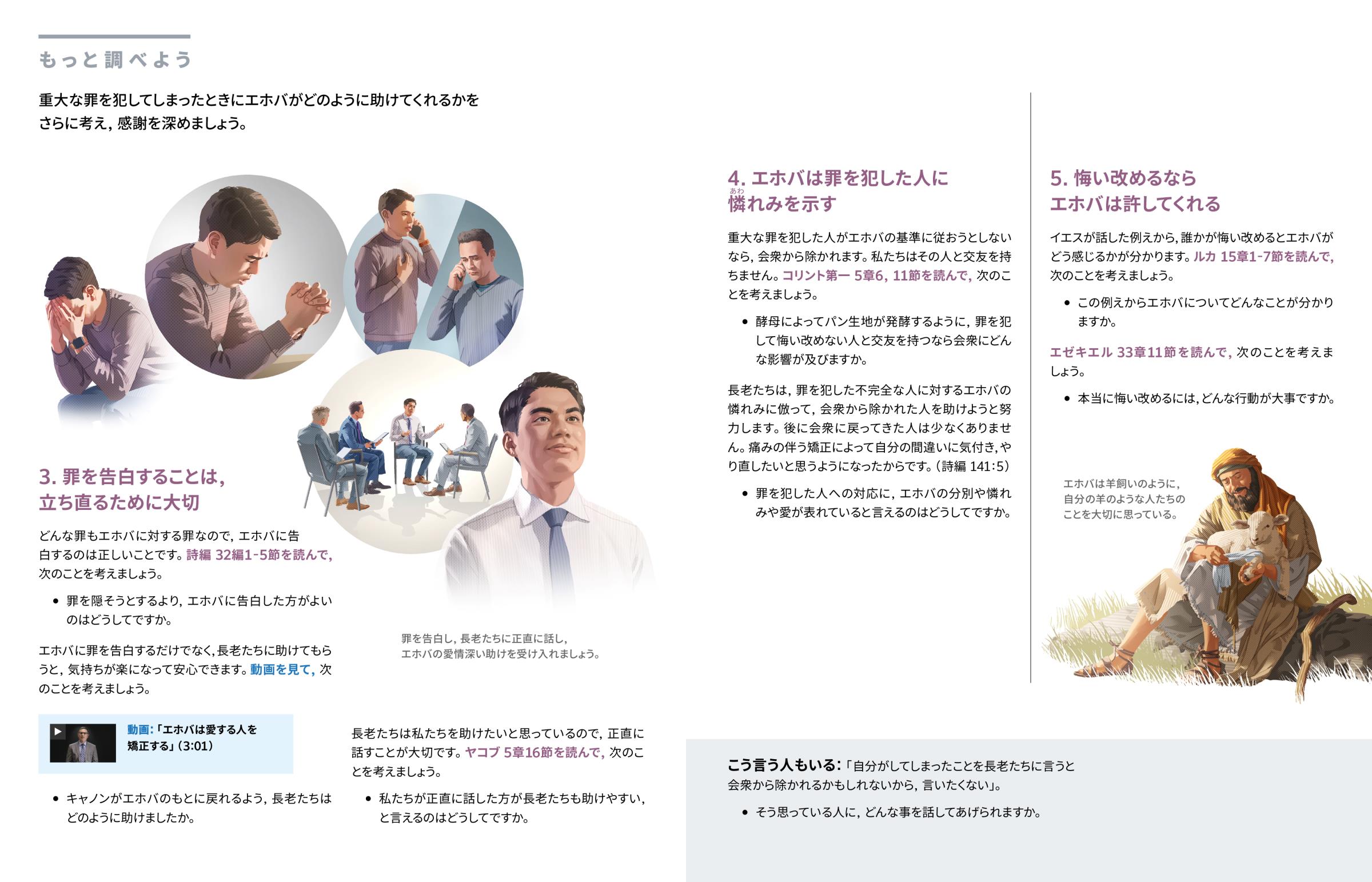 私たちが重大な罪を犯した時,長老たちはどのように助けてくれるのでしょうか。2人か3人の長老が聖書を使って,何が良くなかったのか,どうすれば正しい行動ができるかを教えてくれます。再び罪を犯してしまうことがないように,具体的なアドバイスをし,励ましてくれます。誰かが重大な罪を犯して悔い改めない場合,長老たちは会衆を有害な影響から守るためにその人を会衆から除きます。