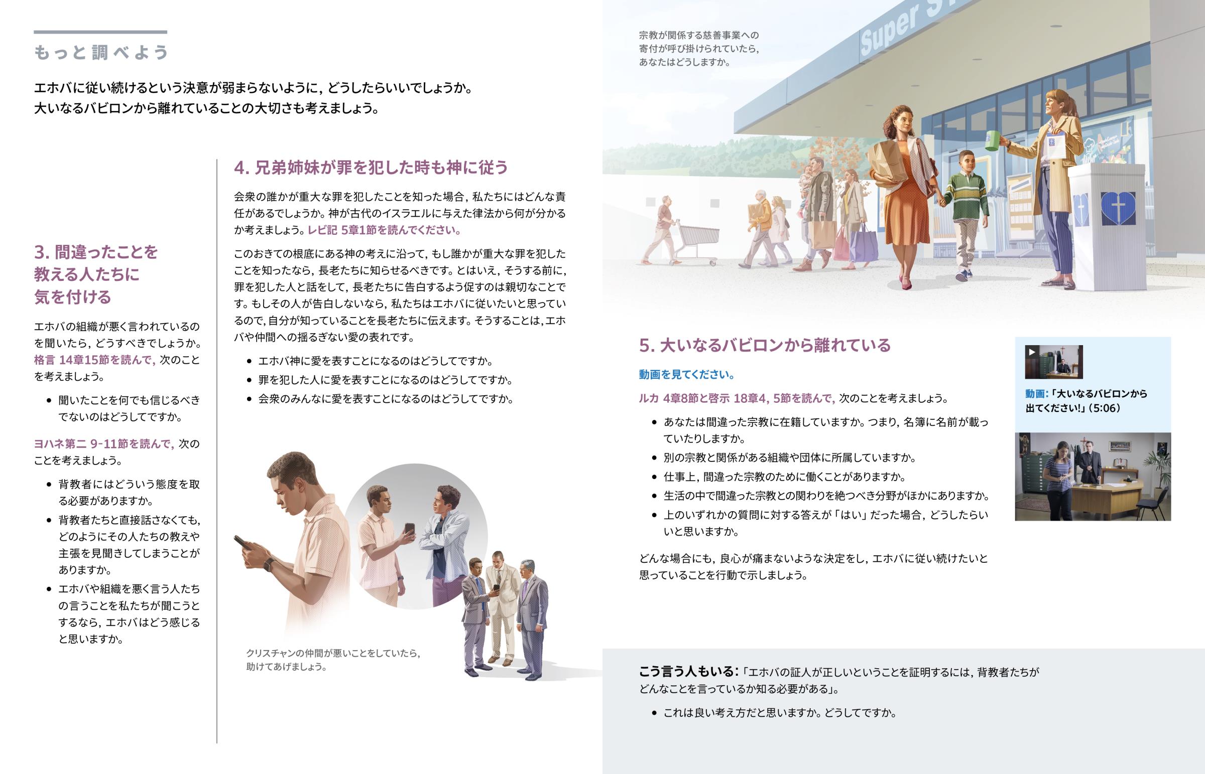 エホバを愛している人は,間違った宗教と一切関わりを持たないようにします。自分が選ぶ仕事や,関わる組織や団体や行事などが,間違った宗教に関係していないかどうかよく確かめることは大切です。エホバは,「私の民よ,[大いなるバビロン]から出なさい」と警告しています。(啓示 18:2,4)