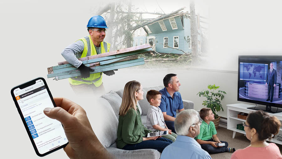 b 写真や挿絵: 家族の頭が忙しい中でも,救援活動に加わり,世界的な活動のために寄付をし,仲間を招いて一緒に家族の崇拝を行っている。