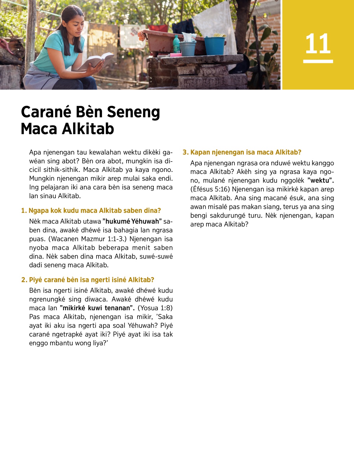 Apa njenengan ngrasa ora nduwé wektu kanggo maca Alkitab? Akèh sing ya ngrasa kaya ngono, mulané njenengan kudu nggolèk ”wektu”. (Éfésus 5:16) Njenengan isa mikirké kapan arep maca Alkitab. Ana sing macané ésuk, ana sing awan misalé pas makan siang, terus ya ana sing bengi sakdurungé turu. Nèk njenengan, kapan arep maca Alkitab?