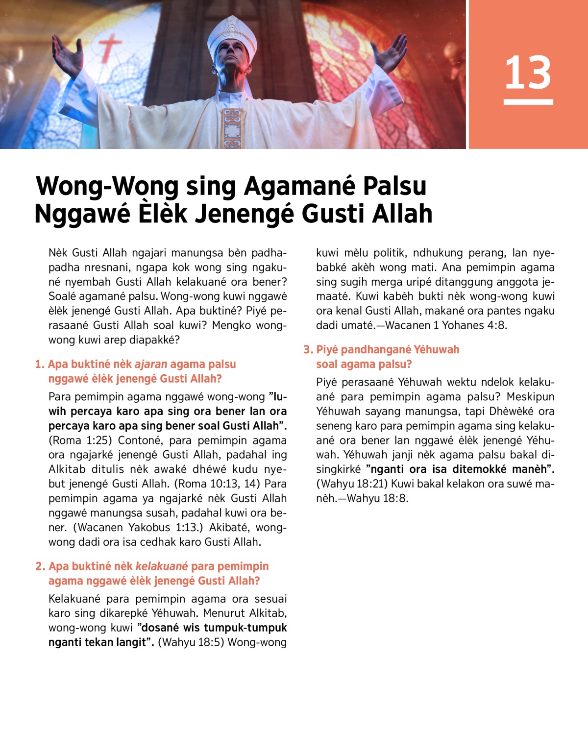 Ayo dirembug piyé pandhangané Gusti Allah soal agama palsu, piyé kelakuané wong-wong sing agamané palsu, lan ngapa kok njenengan kudu terus cedhak karo Yéhuwah.
