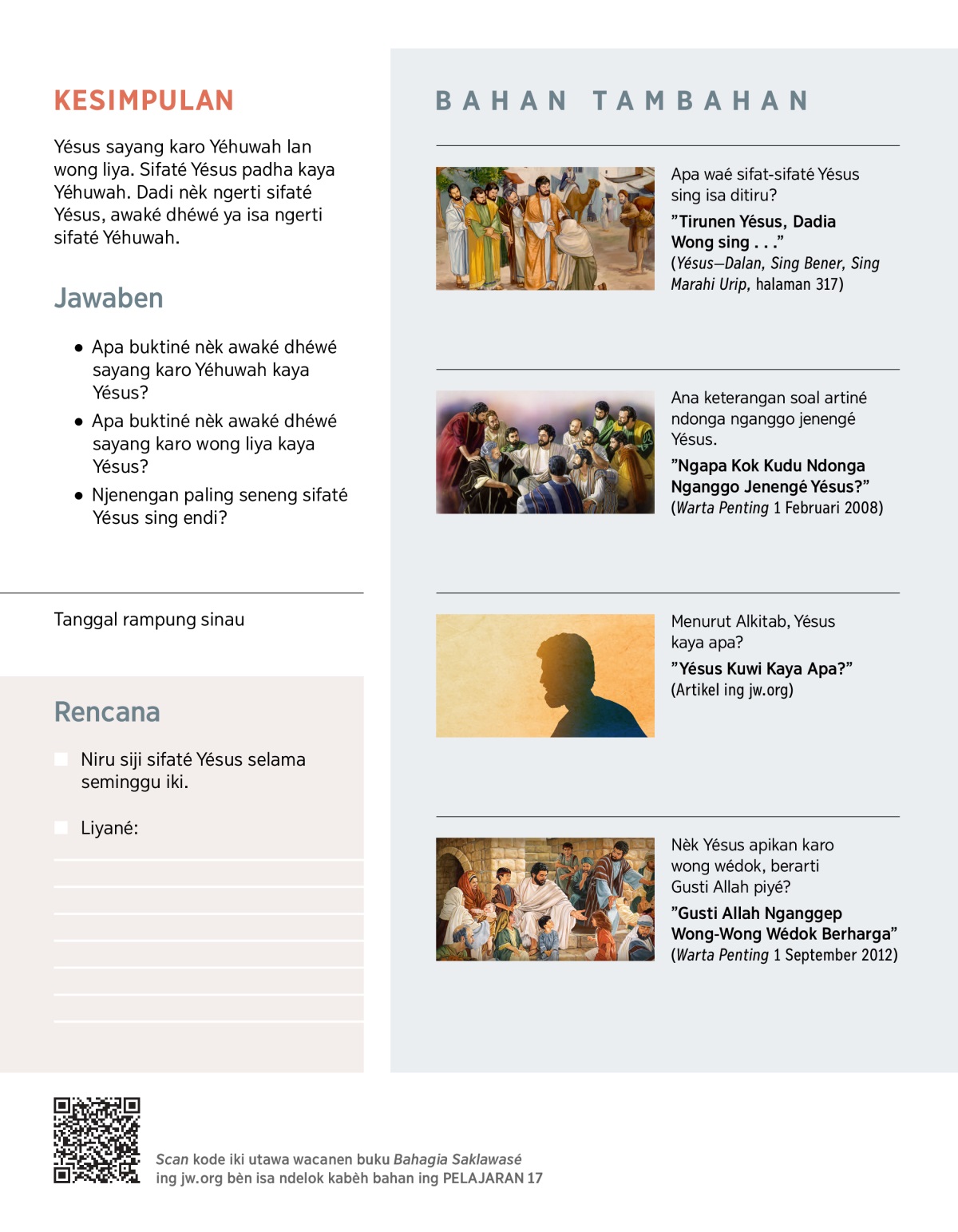 Yésus sayang karo Yéhuwah lan wong liya. Sifaté Yésus padha kaya Yéhuwah. Dadi nèk ngerti sifaté Yésus, awaké dhéwé ya isa ngerti sifaté Yéhuwah.