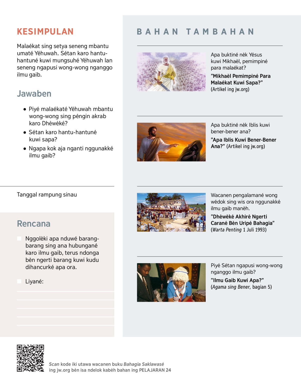 Ayo ngrembug piyé carané malaékat mbantu umaté Yéhuwah, ngapa kok ora olèh nggunakké ilmu gaib, lan piyé carané nglawan Sétan karo hantu-hantuné.
