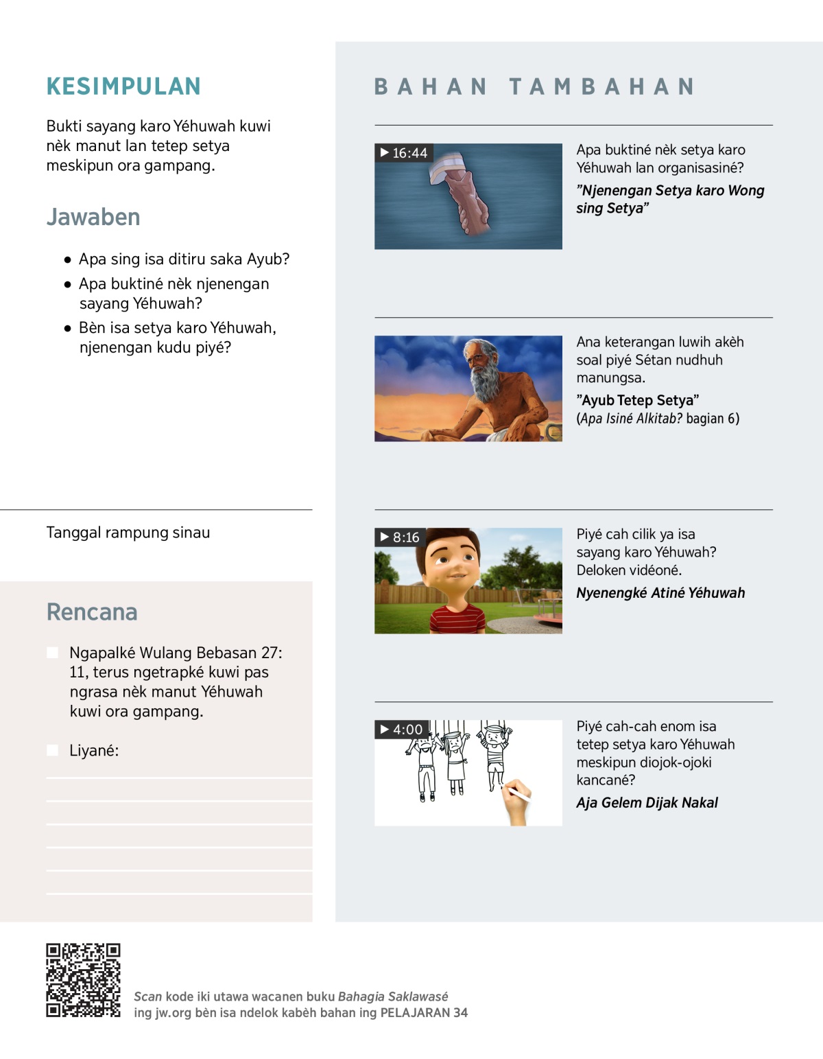 Kèt pertama belajar nganti saiki, apa njenengan ngrasa tambah cedhak karo Gusti Allah? Apa njenengan péngin tambah cedhak manèh? Nèk njenengan tambah sayang karo Yéhuwah, Yéhuwah ya bakal tambah sayang karo njenengan. Apa buktiné nèk sayang Yéhuwah?