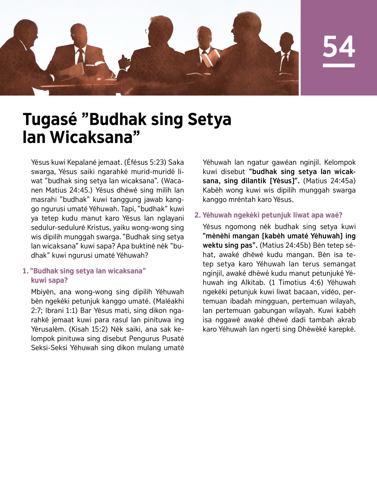 Yésus kuwi Kepalané jemaat. (Éfésus 5:23) Saka swarga, Yésus saiki ngarahké murid-muridé liwat ”budhak sing setya lan wicaksana”. (Wacanen Matius 24:45.) Yésus dhéwé sing milih lan masrahi ”budhak” kuwi tanggung jawab kanggo ngurusi umaté Yéhuwah. Tapi, ”budhak” kuwi ya tetep kudu manut karo Yésus lan nglayani sedulur-seduluré Kristus, yaiku wong-wong sing wis dipilih munggah swarga. ”Budhak sing setya lan wicaksana” kuwi sapa? Apa buktiné nèk ”budhak” kuwi ngurusi umaté Yéhuwah?