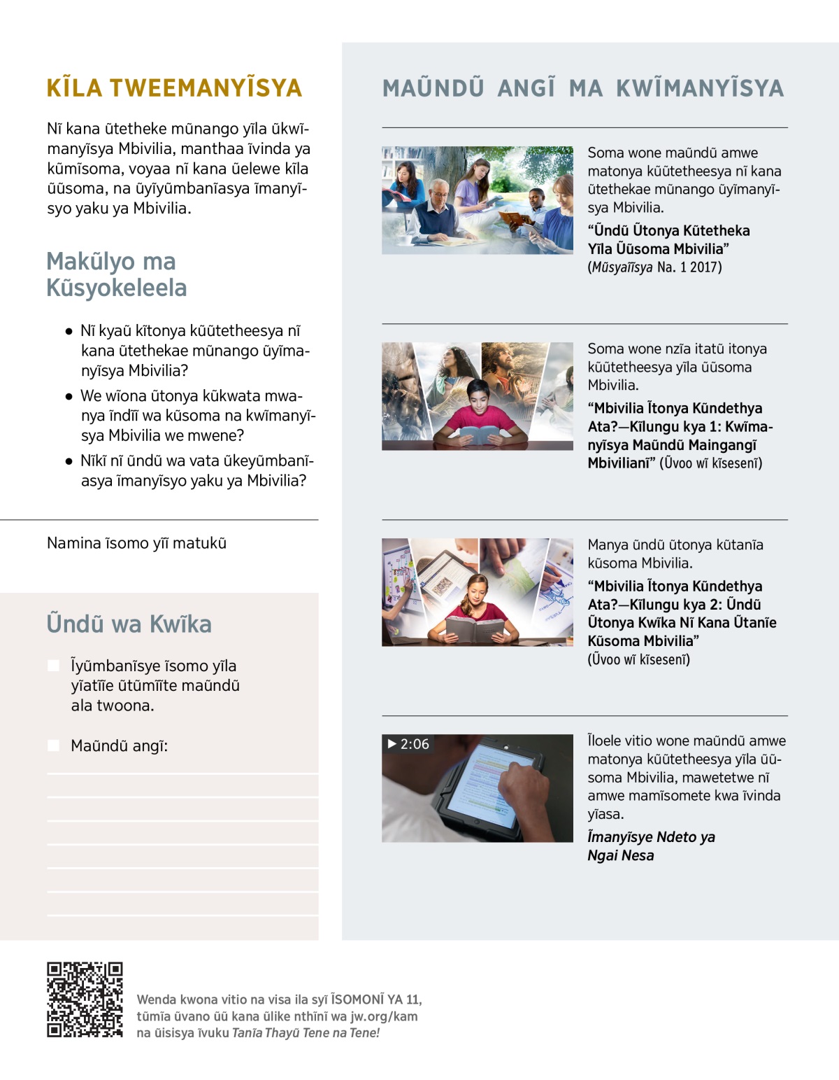Andĩka maũndũ ala wamina kũsoma. Tũmĩa kyati kĩ na kyongo “Manya Ũndũ Ũendeee Kũsoma Mbivilia” kĩla kĩ ĩvukunĩ yĩĩ.