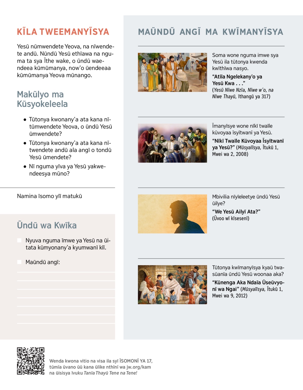 Ngelekanyʼo ya Yesũ yĩtũmanyĩsya ũndũ twaĩlĩte kũmwenda Ngai. Somai Luka 6:12 na Yoana 15:10; 17:26. Ĩtina wa kũsoma kĩla ĩandĩko, neeneai ĩkũlyo yĩĩ: