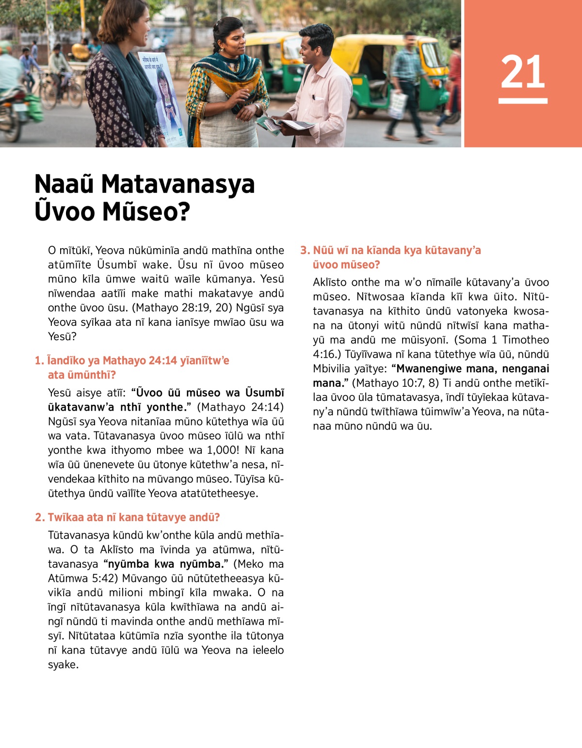 Yesũ aisye atĩĩ: “Ũvoo ũũ mũseo wa Ũsumbĩ ũkatavanwʼa nthĩ yonthe.” (Mathayo 24:14) Ngũsĩ sya Yeova nitanĩaa mũno kũtethya wĩa ũũ wa vata. Tũtavanasya ũvoo mũseo ĩũlũ wa nthĩ yonthe kwa ithyomo mbee wa 1,000! Nĩ kana wĩa ũũ ũnenevete ũu ũtonye kũtethwʼa nesa, nĩvendekaa kĩthito na mũvango mũseo. Tũyĩsa kũũtethya ũndũ vaĩlĩte Yeova atatũtetheesye.